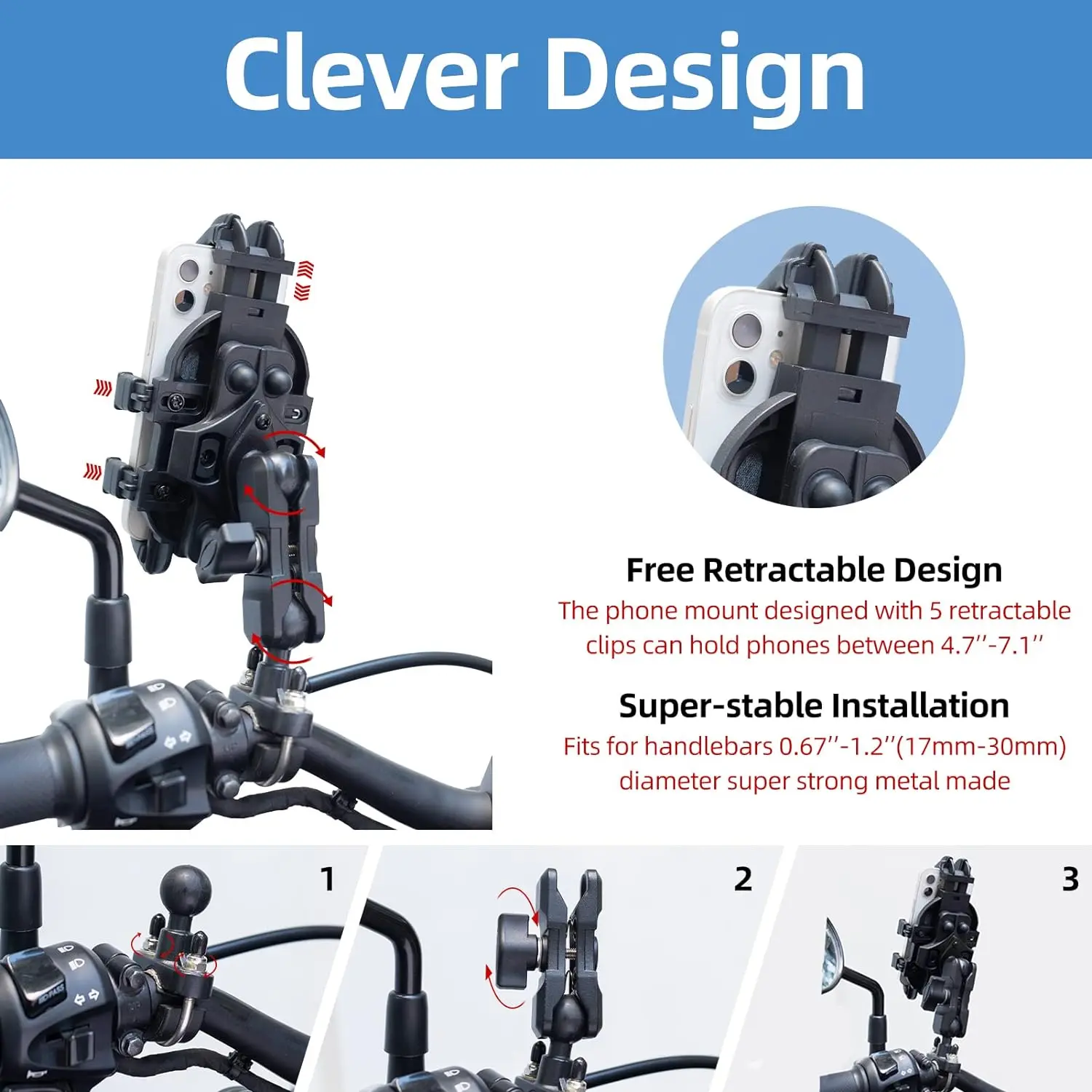 ·【Installation in Seconds】Easy and quick installation with tool (included), the installed base is adjustable and fits for any handlebar between 17mm and 30mm (0.67’’-1.2’’) diameter, such as bicycle, motorcycle, scooter, treadmill, indoor bike and even stroller. And TPU soft rubber pad has non-slip, firm and non-scratch features