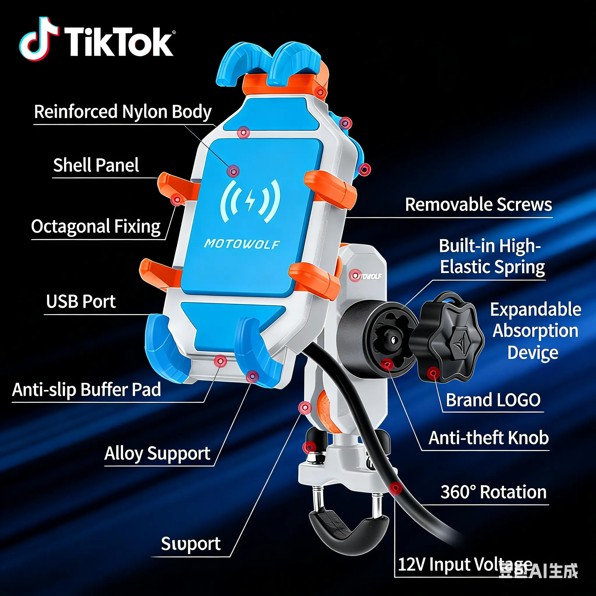 ParameterDetailsMaterialReinforced Nylon + Alloy + High-Elastic SiliconeCharging Type10W Wireless Charging + USB WiredInput Voltage12-24V (fits 12V motorcycles and 24V heavy bikes)Adjustment360° Rotation + Height/Width AdjustableInstallation5 Interchangeable ModesCompatibilityPhones 72mm-91mm wide, Action Cameras (GoPro/Insta360)