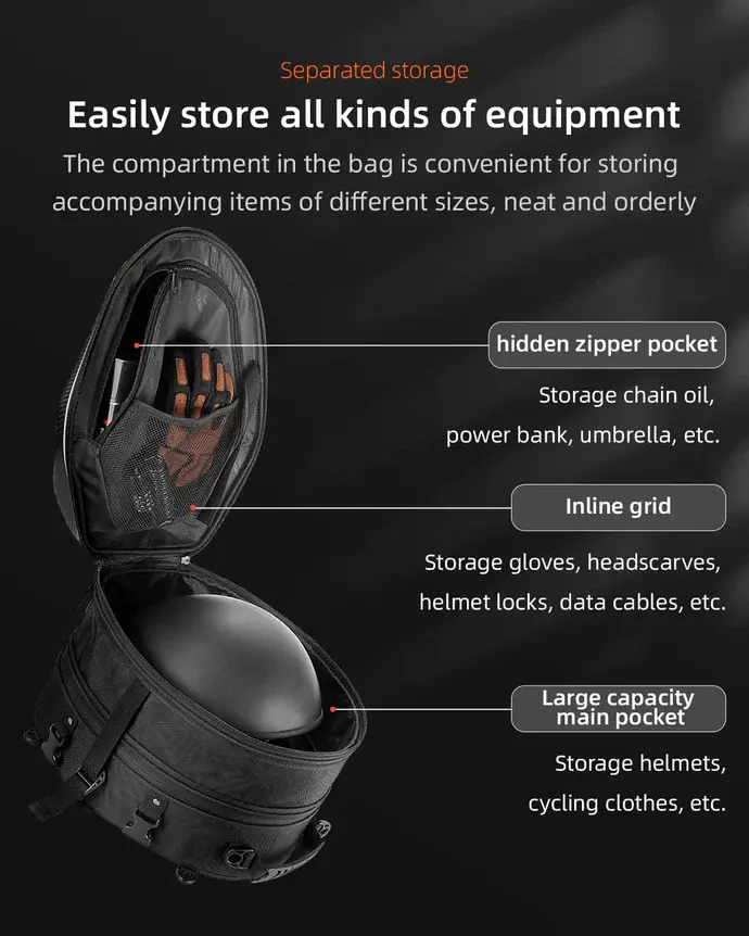 ·WATERPROOF: This motorcycle tail bag is waterproof, if you are still uneasy about its waterproof performance, don't worry, we have equipped you with a free rain cover for you to use, double waterproof, you can use it in rainy days with confidence, Go for a ride in the rain!