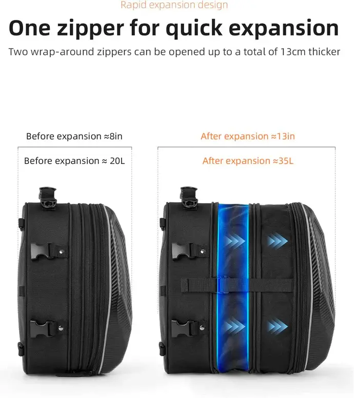 ·SCALABLE LARGE CAPACITY: The height of this motorcycle luggage bag can be expanded from 20 cm to 33 cm, and the volume can be expanded from 20L to 35L. There is also a zippered mesh pocket inside, and the compartment design can hold all the belongings you need and take it. are very convenient.