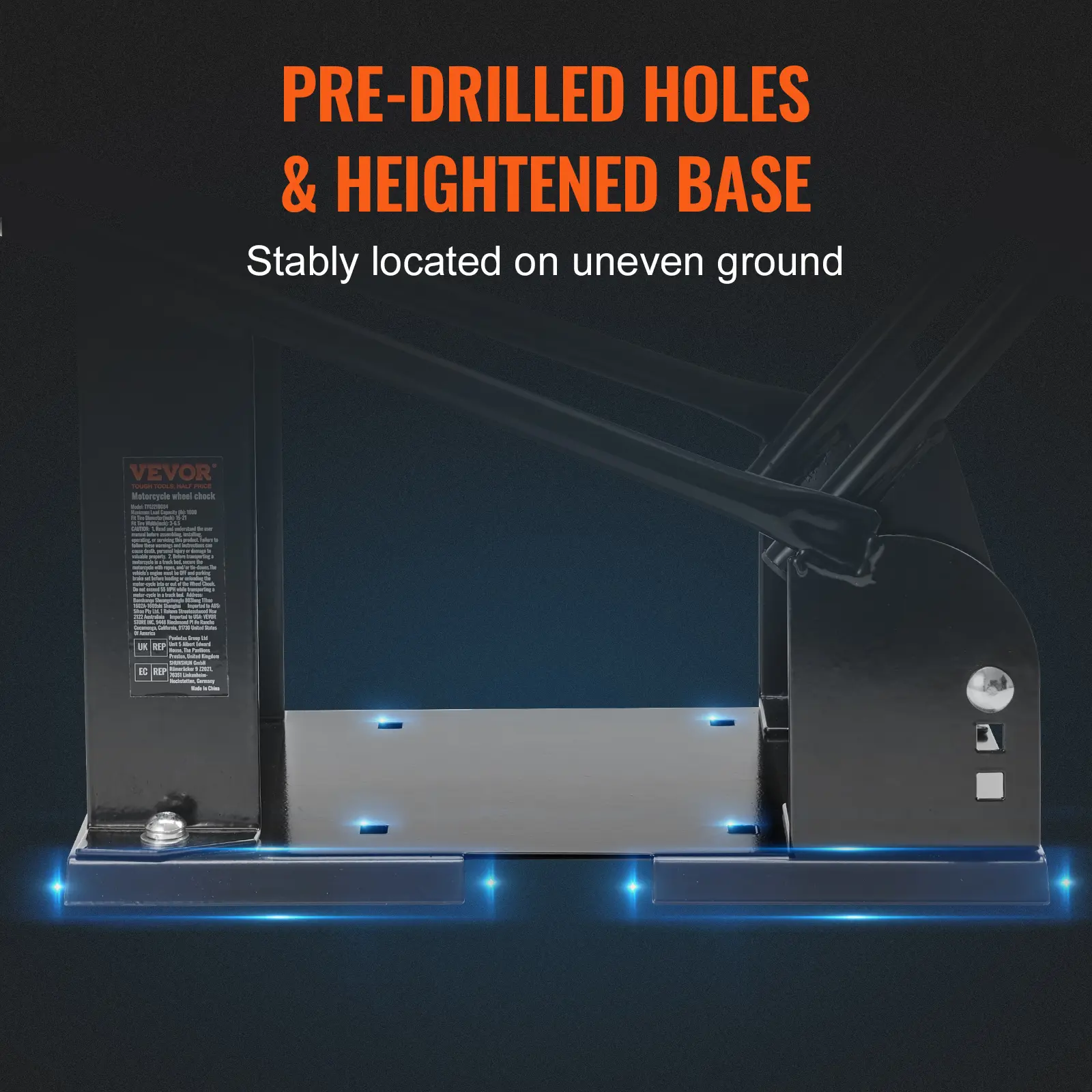 • Enhanced Stability: The wheel chock's base is designed with a raised iron sheet, providing ample ground clearance. This design prevents the motorcycle's center of gravity from becoming unstable on uneven ground, reducing the risk of overturning and enhancing overall stability.