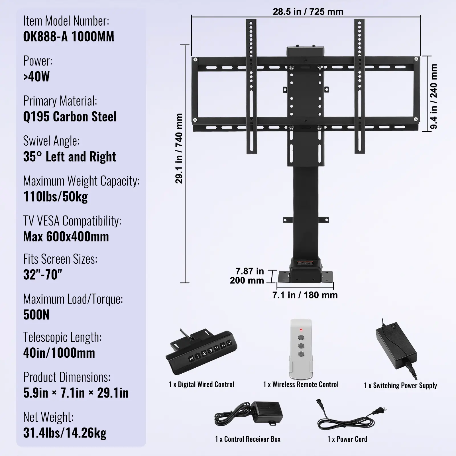 • 【AUTO LIFT/DOWN HEIGHT】- This product supports 4-level hook adjustment. The TV screen can be quickly lifted or down between 28.74"-68.11" height at the speed of 35 mm/s(the fastest on the market). Powerful 1000 N motor to keep the up & down movement safely.