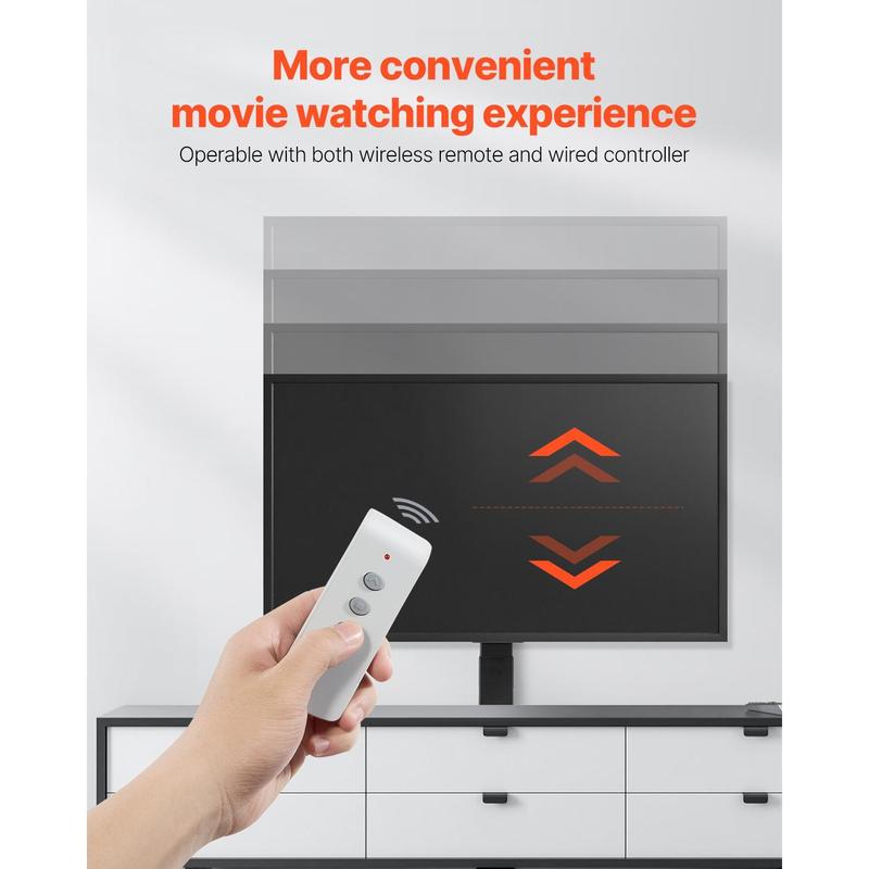 • Infinitely Adjustable Lift: Our mechanism TV lift has a travel height of 39 in / 990 mm, allowing you to easily adjust the height within this range to find the ideal viewing height. You can operate the mount with a wireless remote or wired handheld controller, offering flexible control from any distance.