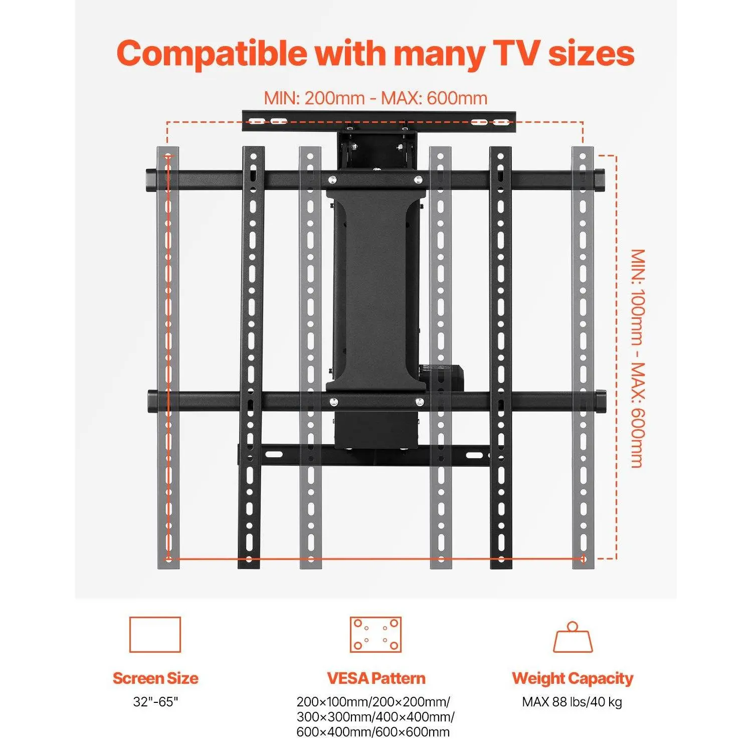·Supports 65 in TVs: This motorized TV wall mount supports flat and curved TVs from 32 to 65 in and is compatible with VESA patterns 200 x 100 mm, 200 x 200 mm, 300 x 300 mm, 400 x 400 mm, 600 x 400 mm, and 600 x 600 mm. Whether setting up a fireplace or a TV stand, this is the ideal solution for mounting your TV.