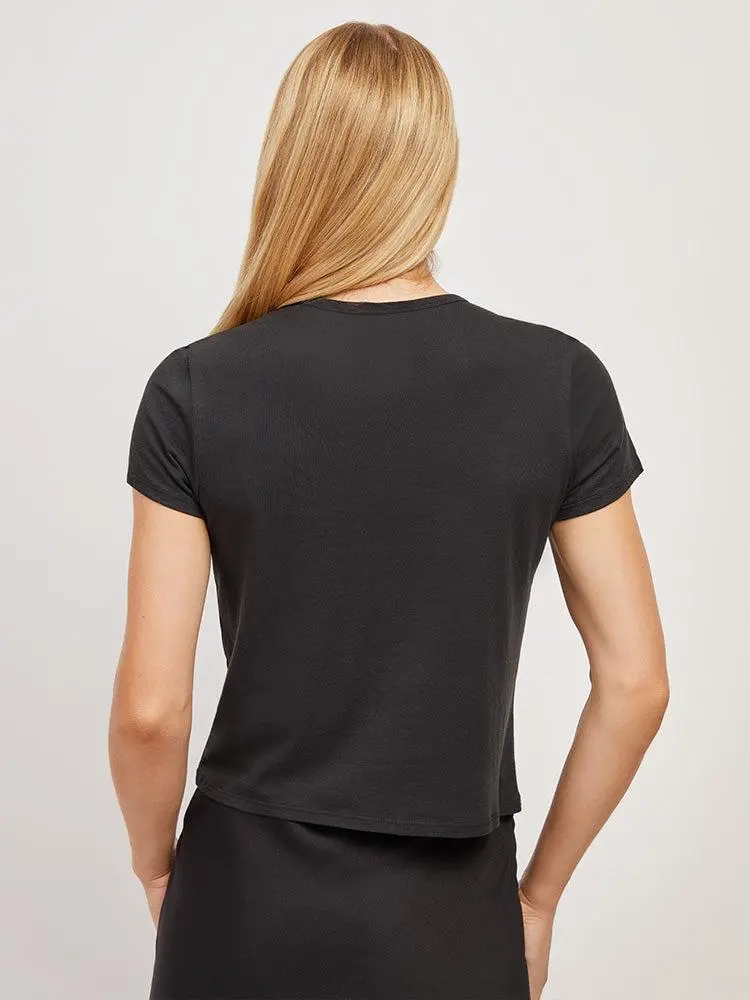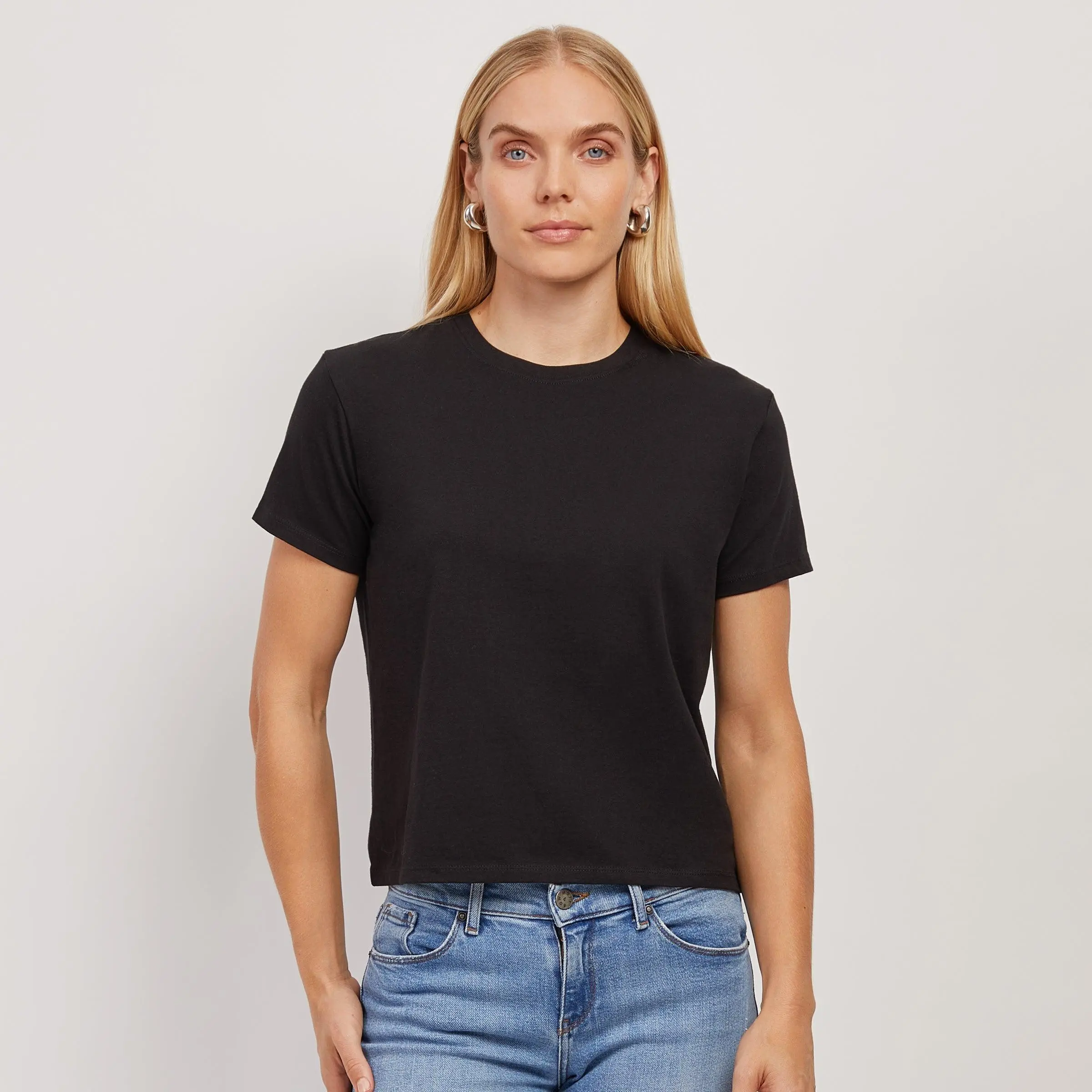 Short-sleeved, fitted tee with a binded neckline that sits closer to the neck and a slightly cropped length that hits at the top of mid-rise jeans.