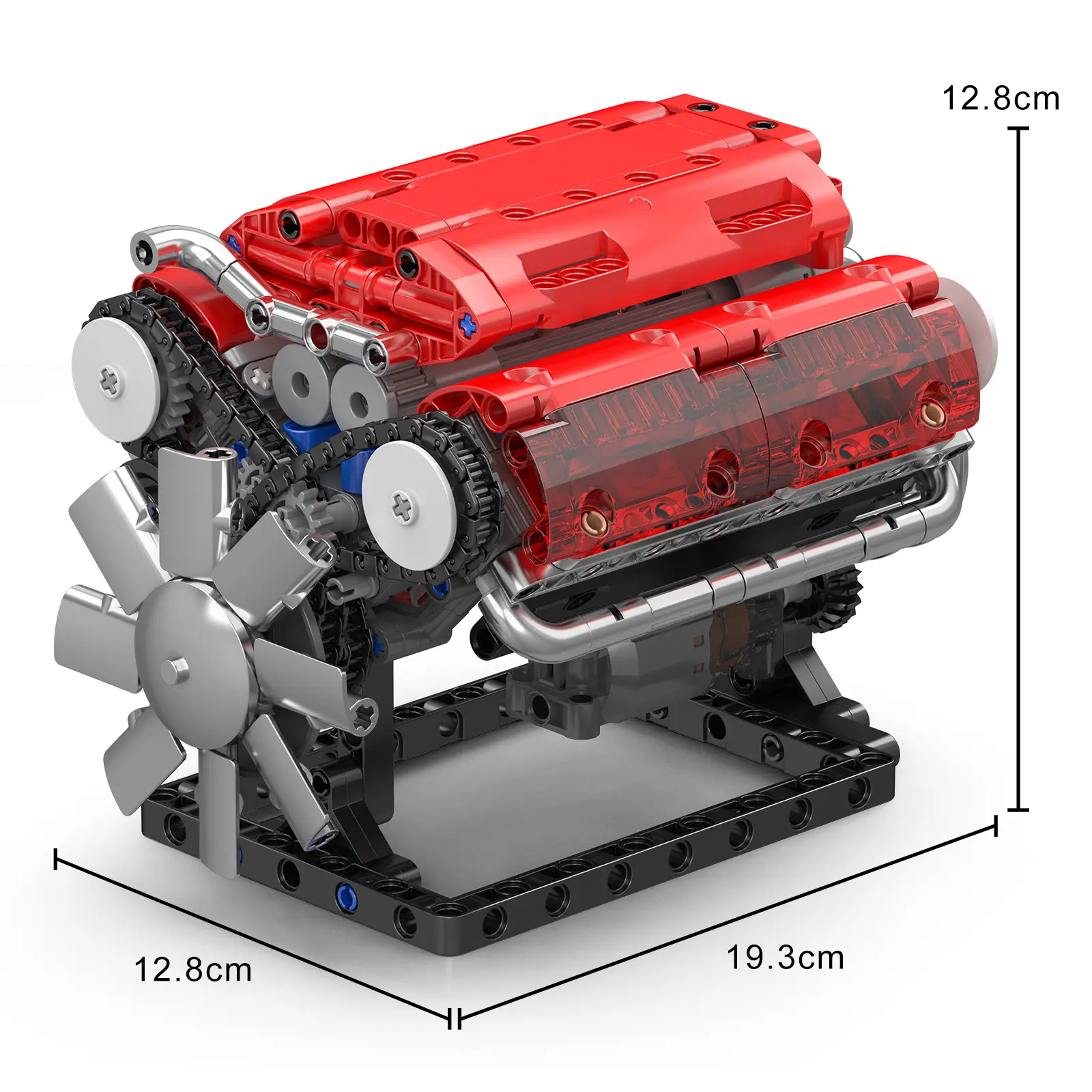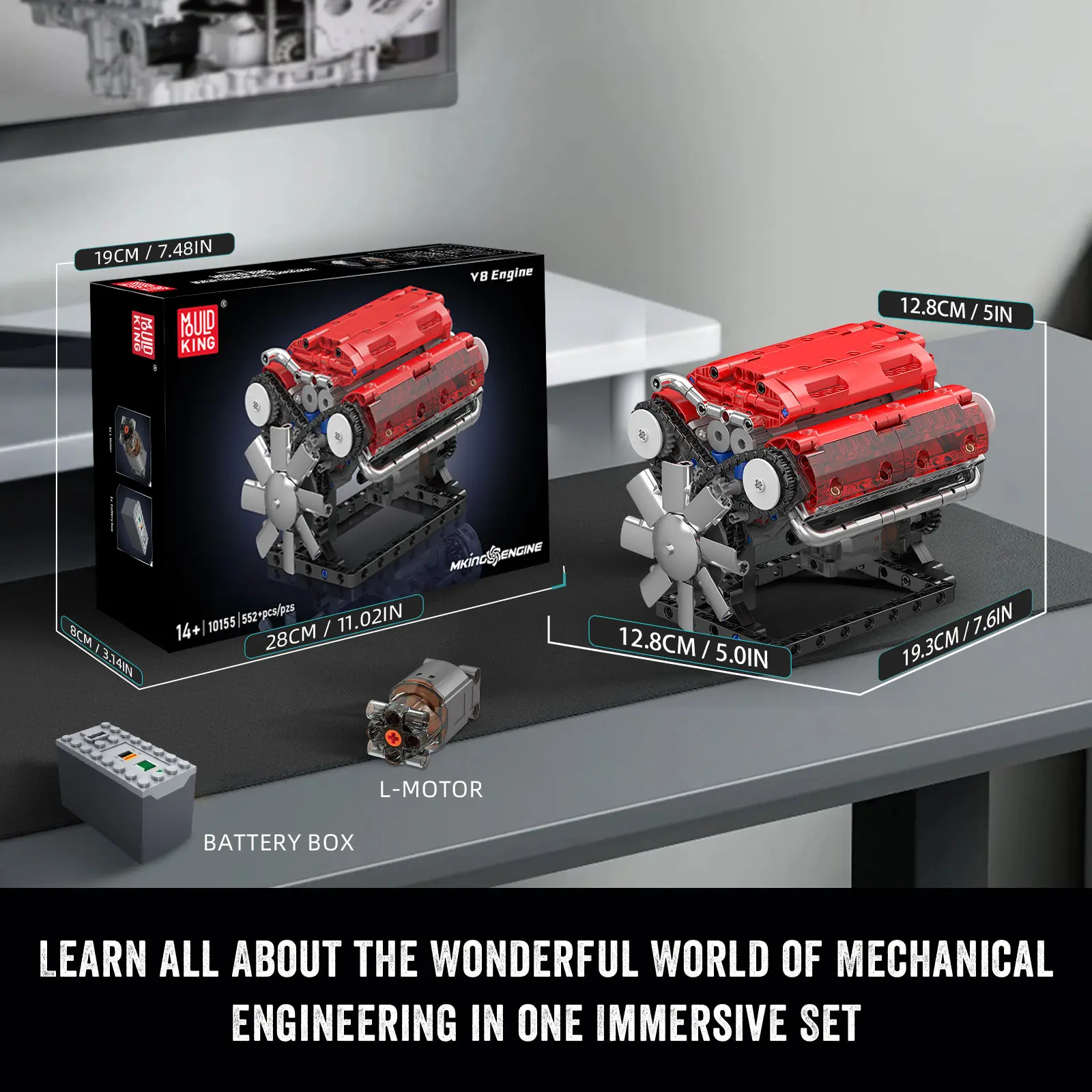 The Mould King 10155 V-type engine model measures 7.6x5x5 inches. It comes with a L motor, an empty battery box, original packaging, and a paper manual. This set is perfect for adults and kids, offering a fun STEM activity. It's an excellent gift for various occasions like New Year's Day, Valentine's Day, Children's Day, and Christmas.