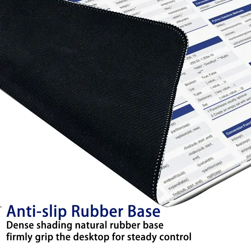 Quality of work: Feels like an average quality desk mat. Love the artwork.. Material: Feels soft and smooth on top. Has a rubber grip on bottom.. Assembly: Easy to put down on whatever flat surface you have..