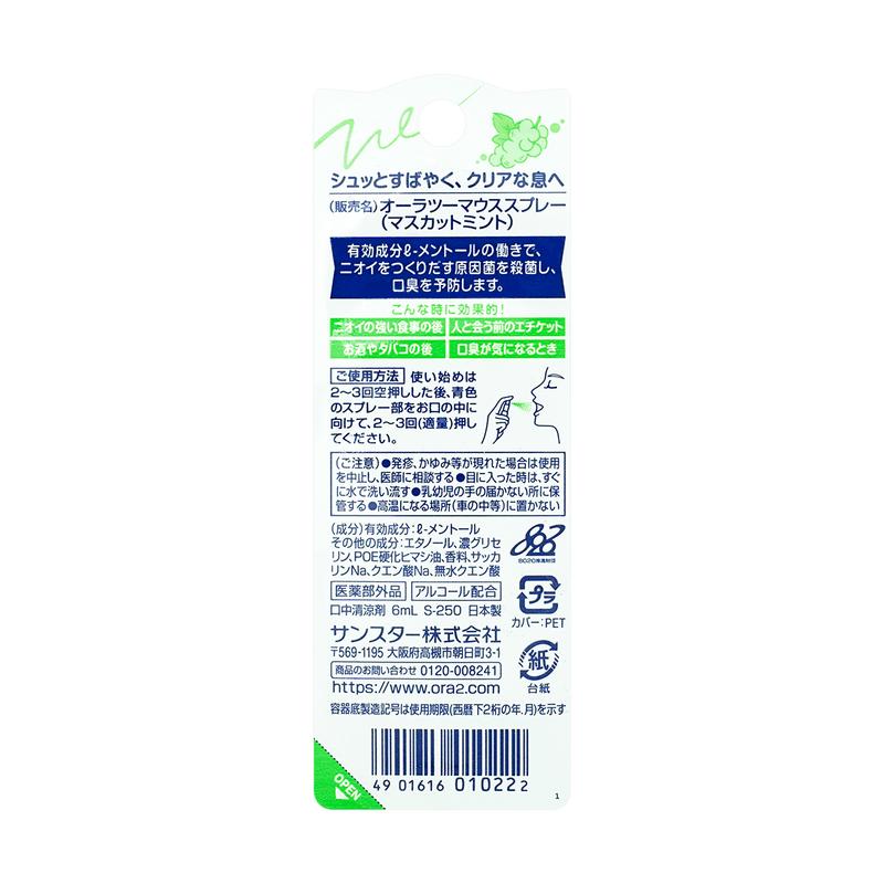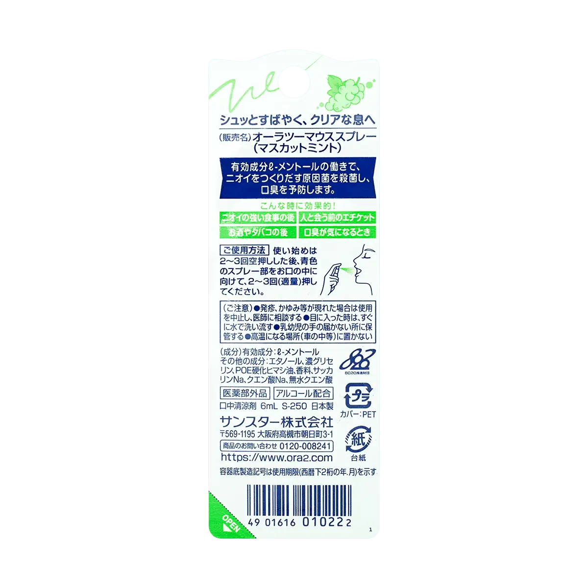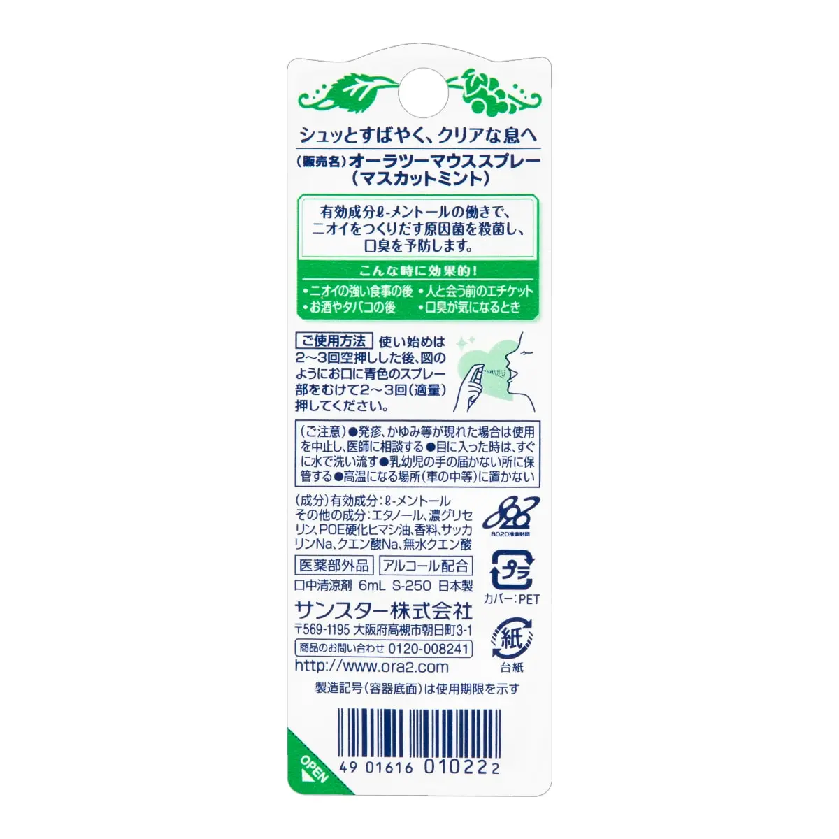 Introducing SUNSTAR ORA2 Mouth and Breath Spray in delightful Muscat Mint flavor. This 6ml spray is your secret weapon for instant freshness and confidence!
