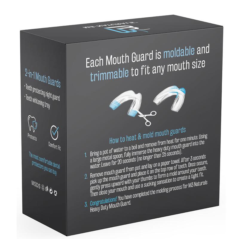 Will start with the main oddity that needs to be addressed: the packaging and this listing are confusing as to what is included. What is ACTUALLY included are 2 sizes of the two types of mouth guards included. So 1 each adult and child size of the clear version, and 1 each adult and child size of the thicker, frosted plastic version. Doesn't seem to detail anything about what to use where, or for what purpose, nor does the second version appear in the listing specifically. Not a huge deal, just hope they can maybe update their packaging (and this listing) in the future. Took a bit of looking for something like this, because everyone seems to sell relatively the same product at nearly the same price. In the Q&A section, I read this is apparently made in USA (or some facsimile of words), although the packaging only indicates 'Distributed by' with a Florida address. I suppose at the very least, this would be supporting an American company, but I don't see any indication that the product itself is made in USA. Onto the product itself, a malleable plastic teeth guard of sorts. I suppose in a cost-savings measure, the directions are only on the outside of the box, and the box only contains the product itself (no standard warranty card, directions for use, etc). Just an observation, not really a big deal. The directions on the back are probably better than most, since it defines 'boiling water, then take off heat for 1 minute' to establish water temperature, rather than giving a temperature range. Following the exact directions (boil water, turn off heat for 1 minute, soak for 20 seconds), everything worked great and exactly as intended. The next part was trimming. They definitely come with enough excess to fit any mouth, and I had to trim a fair bit so that it wasn't just filling my mouth. Granted, I only purchased this to protect my front teeth specifically, and prevent grinding of my molars, so it may depend on your specific use case. One suggestion I can make to others is to cut at an angle. Using sharp scissors, the materials itself still end up with squared-off edges that are at least a 1/16" thick, which is very substantial in the mouth. At least with slanted edges, you don't feel it as much in place. I just wish there was a better way to get rid of the excess thickness in places. Tried a utility knife and hobby knife with limited success. Remolding might theoretically works. Overall, it suited my needs and is working fine. No weird taste or anything like that. Was easy to setup. only thing left is to see how long it lasts before replacement.