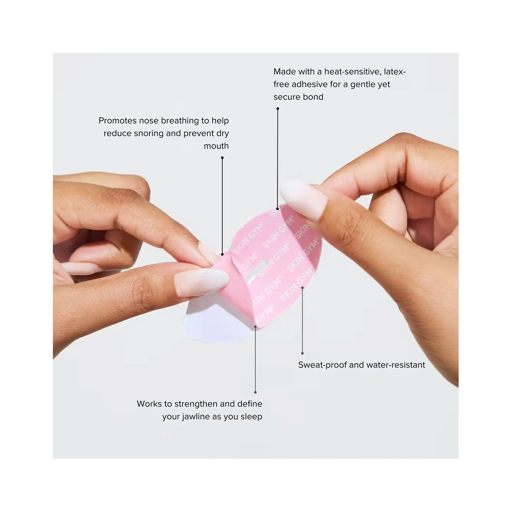 Achieve better sleep and improved well-being with the Skin Gym Mouth Tape. This simple yet effective tool helps reduce snoring, enhances sleep quality, and prevents dry mouth. The latex-free adhesive ensures a gentle, comfortable fit for all skin types, while the kiss-shaped design adds a touch of charm.