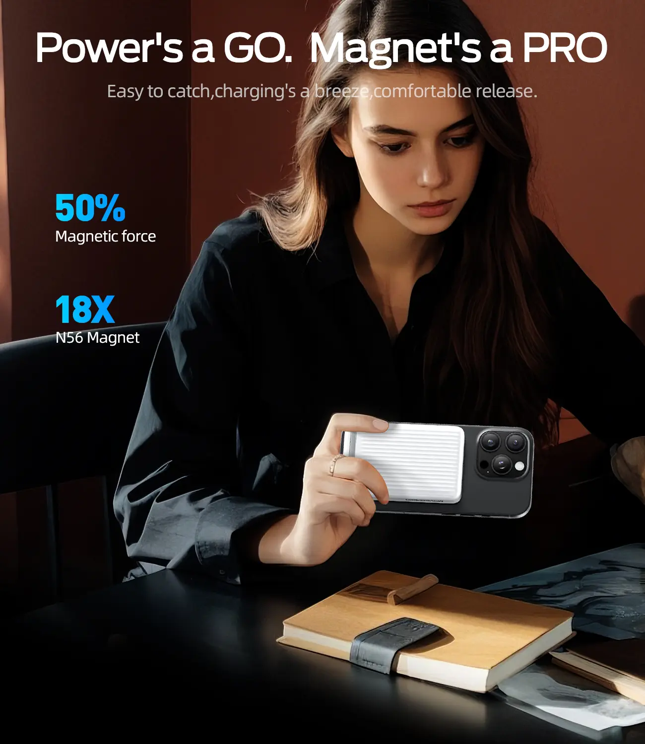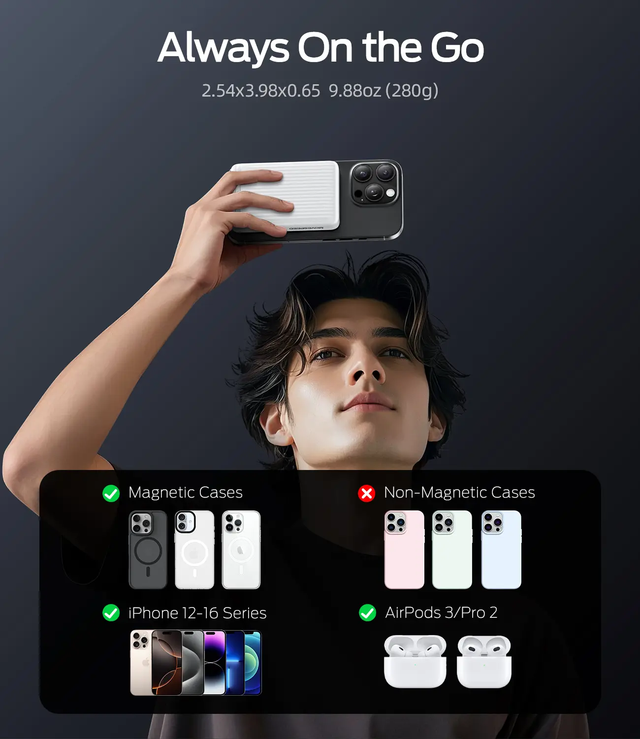 ·Effortless Charging with MagSafe Compatibility:Experience the convenience of Qi2 Certified MagSafe technology, allowing you to snap your iPhone 12/13/14/15/16 onto the battery pack for effortless, secure charging. No cables, no hassle—just drop and go. Whether you're at home, in the office, or traveling, this charger ensures you stay powered up without interruptions.