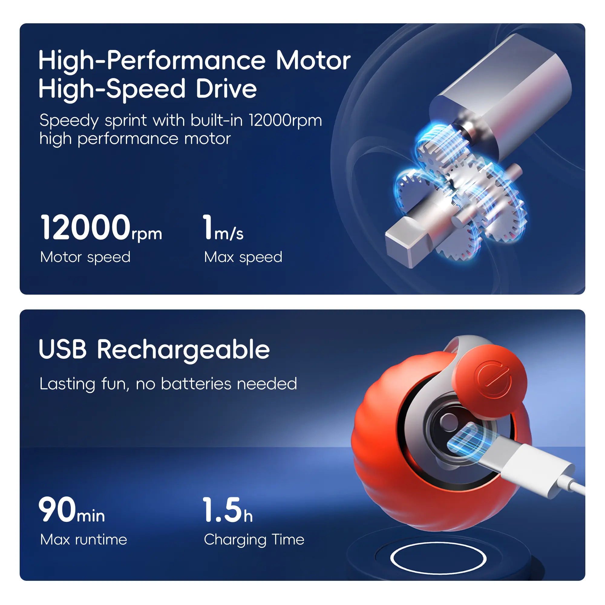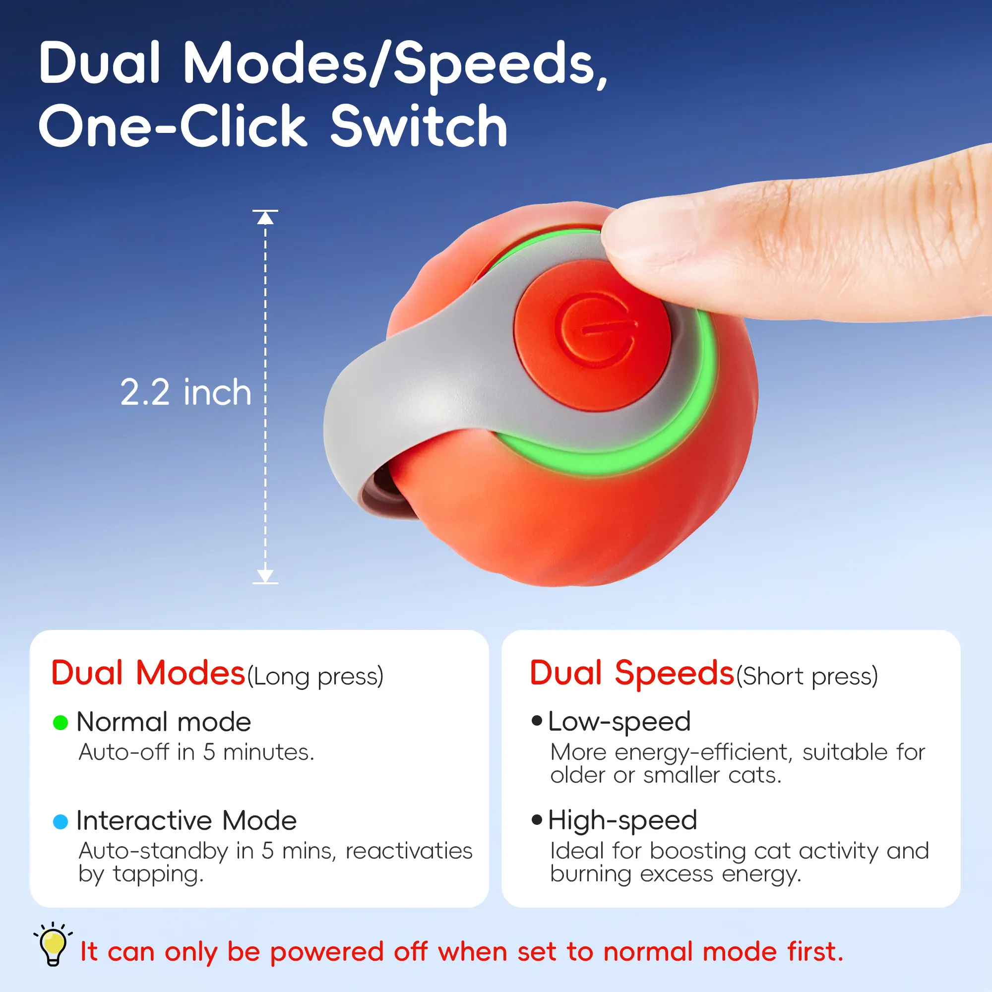 Two-Speeds and Two-Modes for Endless Stimulation ā Toggle between low and high-speed settings with just a short press on the button. Whether your adult cat or kitten prefers a slow roll or speedy action, this toy adapts to their activity level for non-stop exercise and enrichment. Long press the button to toggle between Normal and Interactive modes, catering to your cat's needs.
