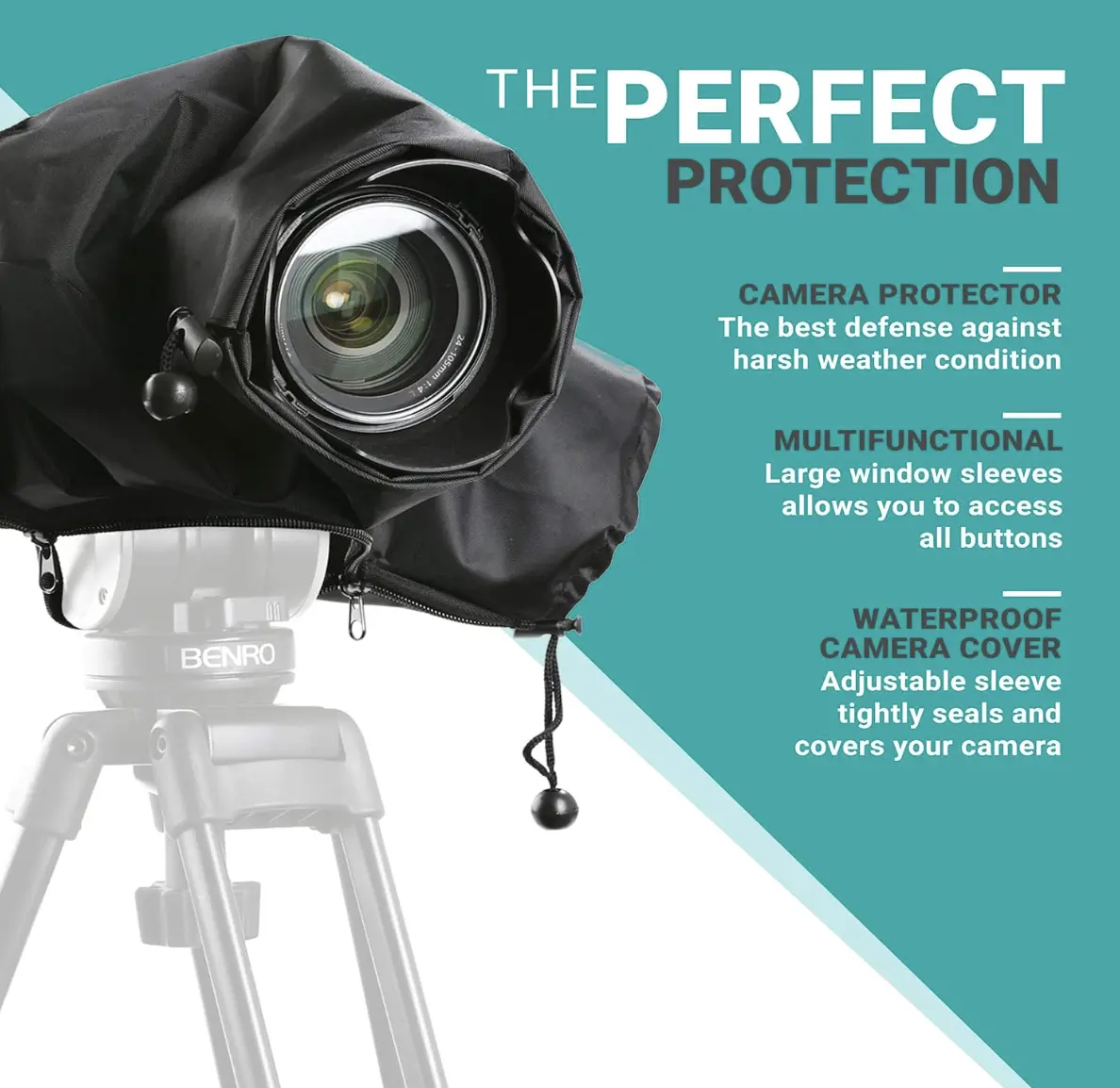 Adjustable Design: The adjustable sleeves and cinch band create a tight seal around your camera and lens, preventing any moisture or debris from entering.