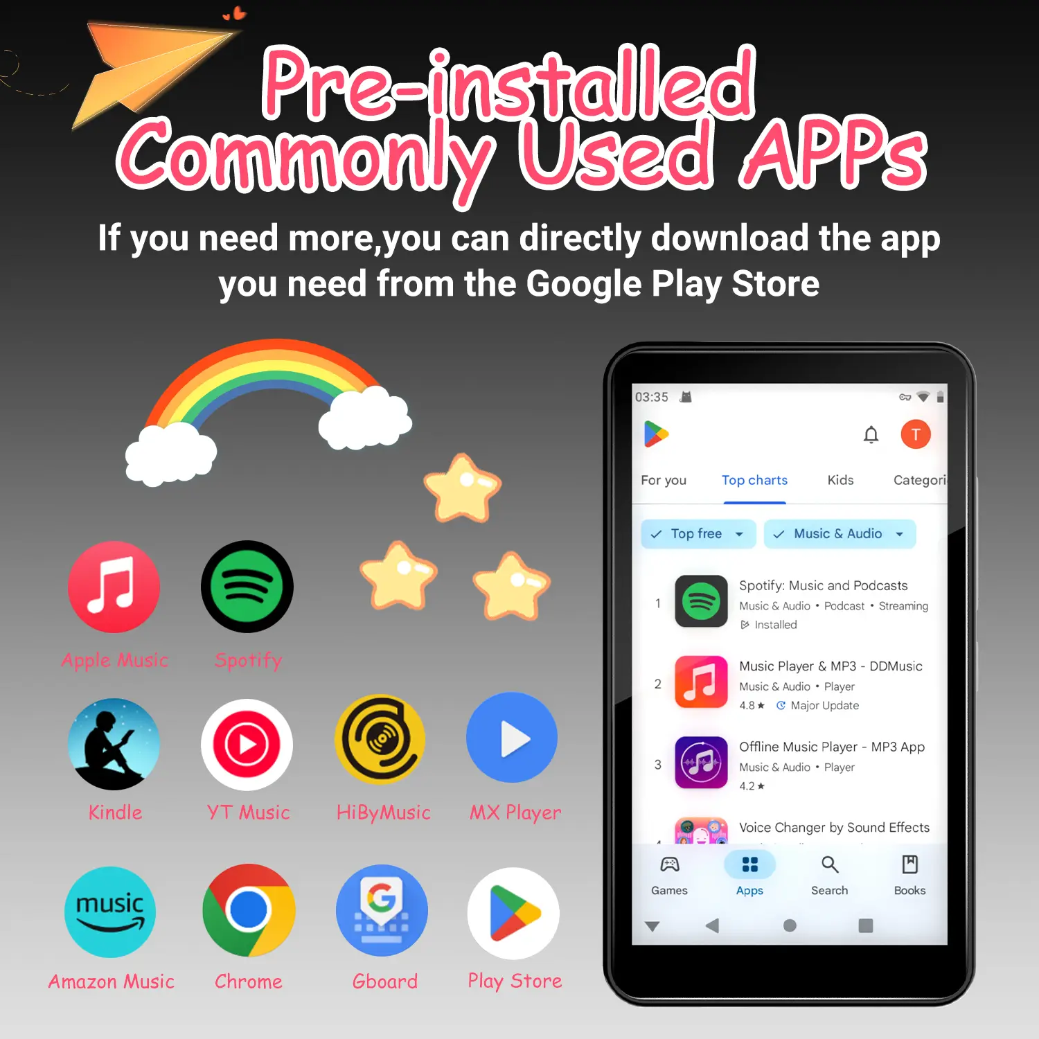 ·【Android 9.0 & Parental Controls】Experience the full freedom of the Android system with seamless access to the Google Play Store. It's the portable MP3 player for kids, allowing you to safely download and update apps like YouTube Kids, Kindle, Spotify, Amazon Music and Apple Music. Essential apps are pre-installed for instant setup. Powerful parental controls let you easily manage content, set screen time limits, and create a secure digital environment for your child.