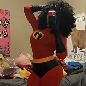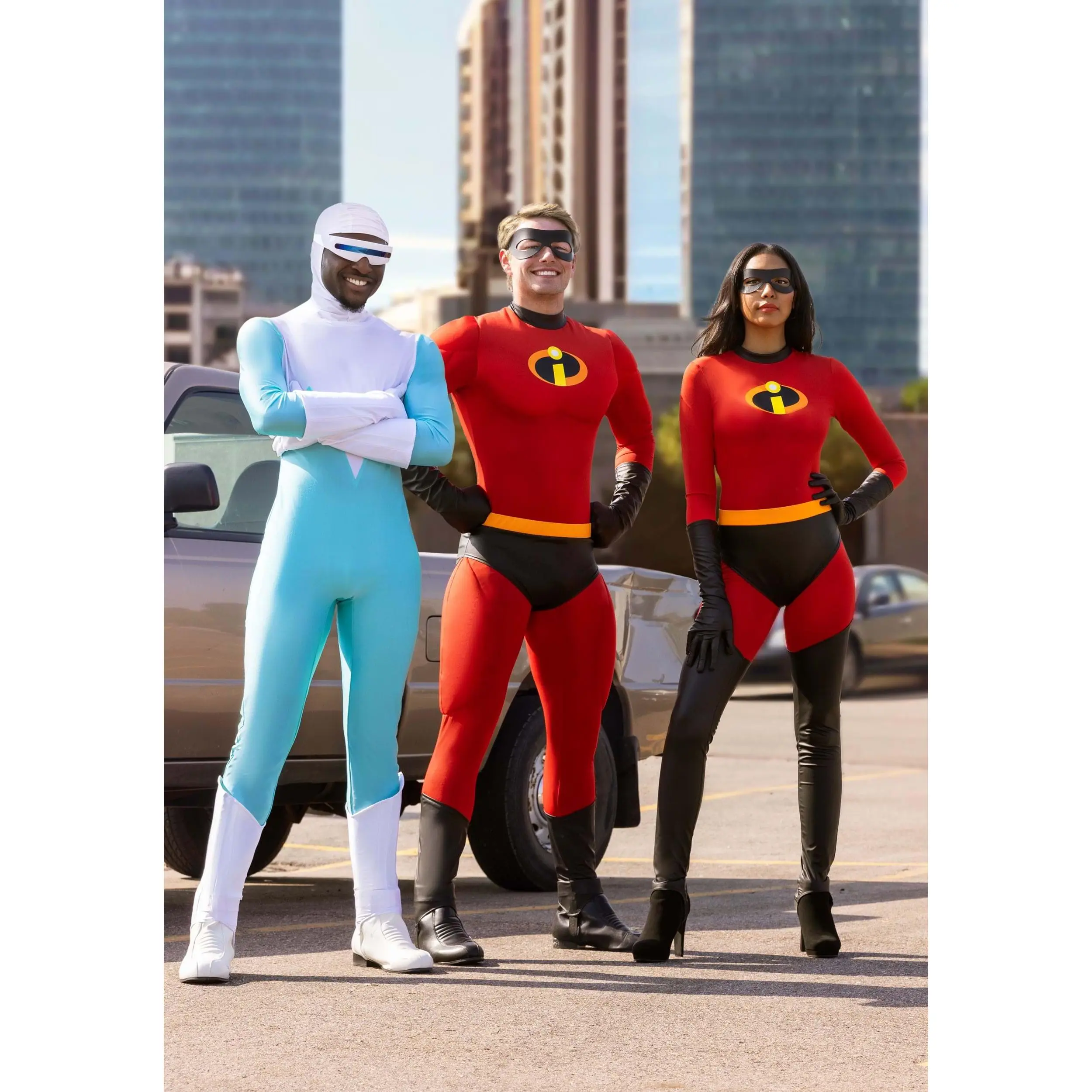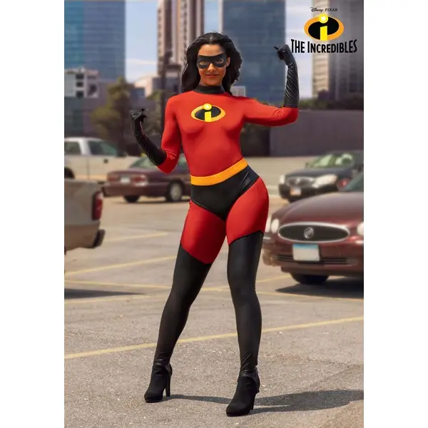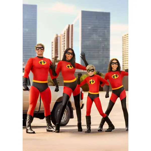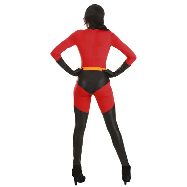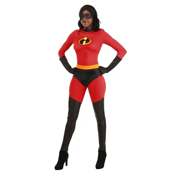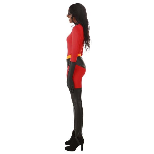 Inspired by the character from Disney and Pixar's The Incredibles, this costume starts with a red jumpsuit made from stretch knit material with a back zipper. A layer of fabric is attached to the legs so you can make any black shoes look like thigh-high boots. Add the black gloves, briefs, and mask to keep your identity safe while you go save the world!