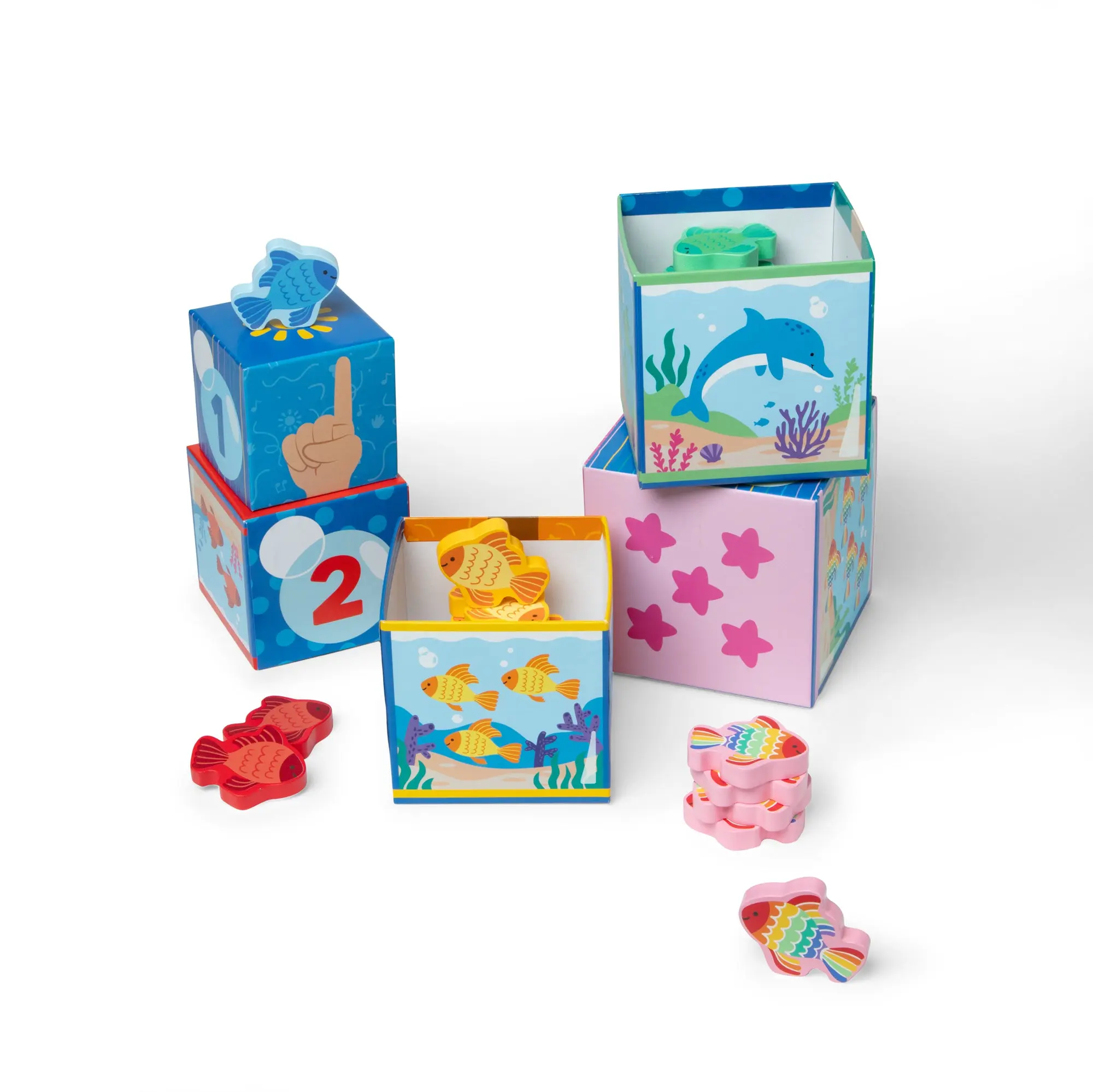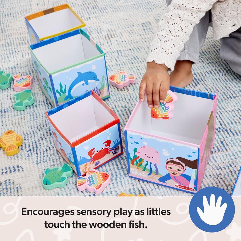 Play and learn with popular educator Ms. Rachel™! Stack, sort, match, count, and learn with this fun and educational Melissa & Doug play set for toddlers and preschooler two and older. Themed after Ms. Rachel’s popular “Bubble, Bubble, Pop!” song, the five sturdy cardboard nesting cube “fish tanks” also stack into a fun tower. The sides of each cube include numerals, the corresponding number of fingers, colorful fish to count, and underwater scenes. Sort 15 wooden play fish by matching them by color and number and dropping them into the blocks! The Melissa & Doug Ms. Rachel™ play set includes a special bonus Learning Card with play ideas and skill-building tips for caregivers. These Melissa & Doug toys are toddler learning toys, designed by Ms. Rachel™ and developmental experts, to support all children through their ages and stages, from 2-5+ years. Ms. Rachel™ toys are ideal newborn toys, toddler toys, preschool toys, and wooden toys. From baby shower gifts to baby essentials, these products help babies and families learn, bond, and thrive. Ms. Rachel™ is a real teacher and passionate educator, with two master’s degrees in education, who creates research-based videos and products to support learning for littles. This product is certified by the Forest Stewardship Council. FSC certification ensures that products come from responsibly managed forests that provide environmental, social, and economic benefits, and that forests are protected for future generations. Please note that FSC certification applies to new inventory only (FSC C156584)
