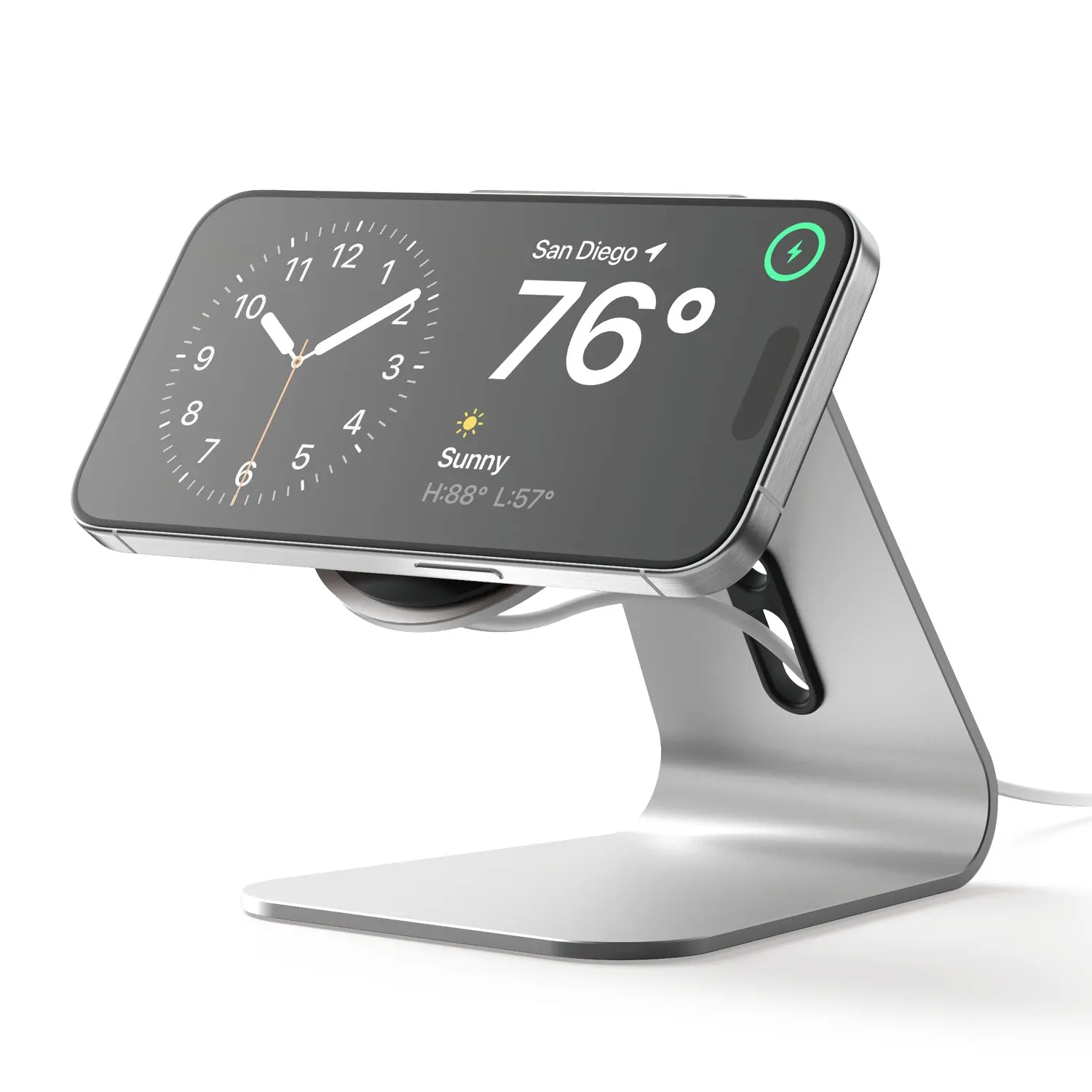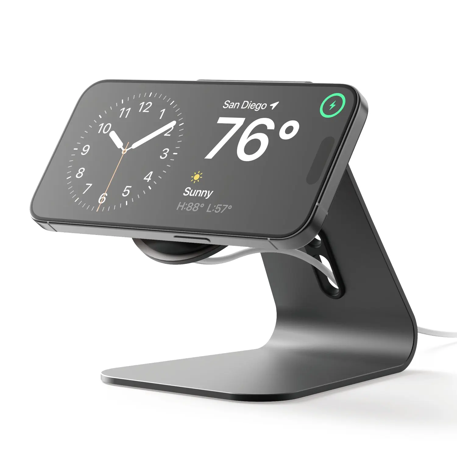 Organize the cable clutter with designed cable cutouts; simply pull the cables through the designated space to help keep your areas clean and tidy! (compatible with MagSafe, but is not included). Disclaimer: to use the stand properly, your phone needs to have a case that is compatible with MagSafe with magnets built into the case or no case at all
