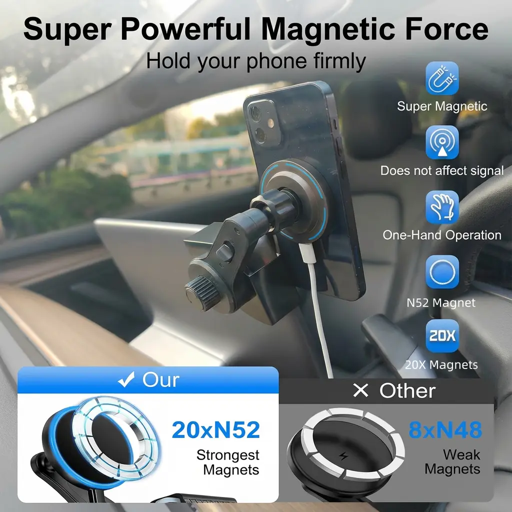 ·QI2.0-Certified 15W Wireless Charging Phone Mount: Offically QI2.0-certified for safe, efficient 15W fast wireless charging. It holds your phone securely while powering up—compatible with most Qi-enabled devices. 📱