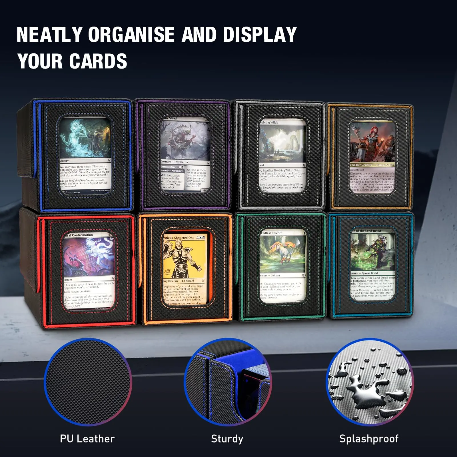 ·Display Window for Your Commander Deck: The mtg commander deck box is customized for EDH Commander players. You can securely store your Commander/Leader cards in the included card holders. The mtg deck box allows you to display your Commander character through the window, and easily view the deck in each card box without opening it, stylishly displaying your collection.