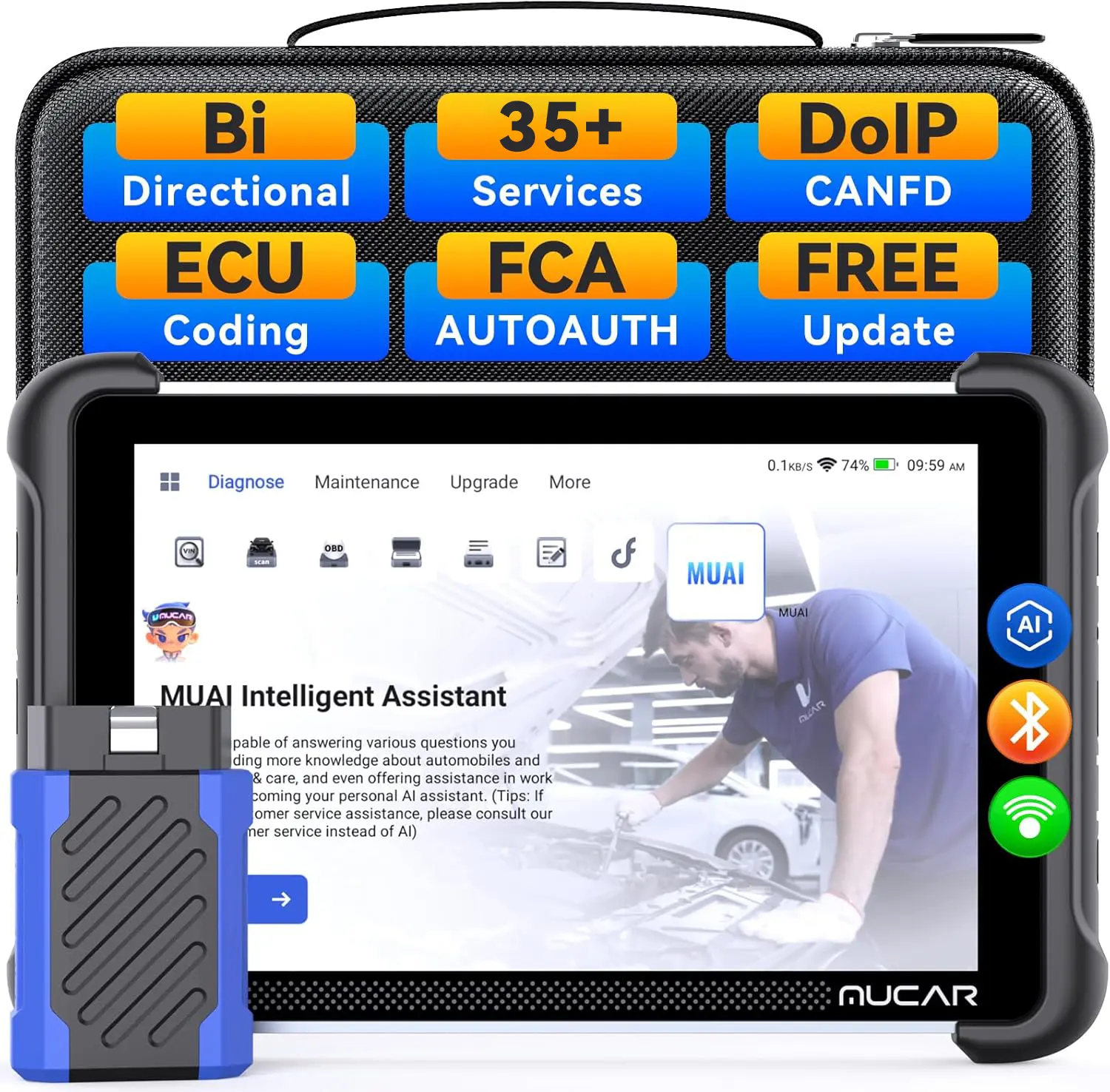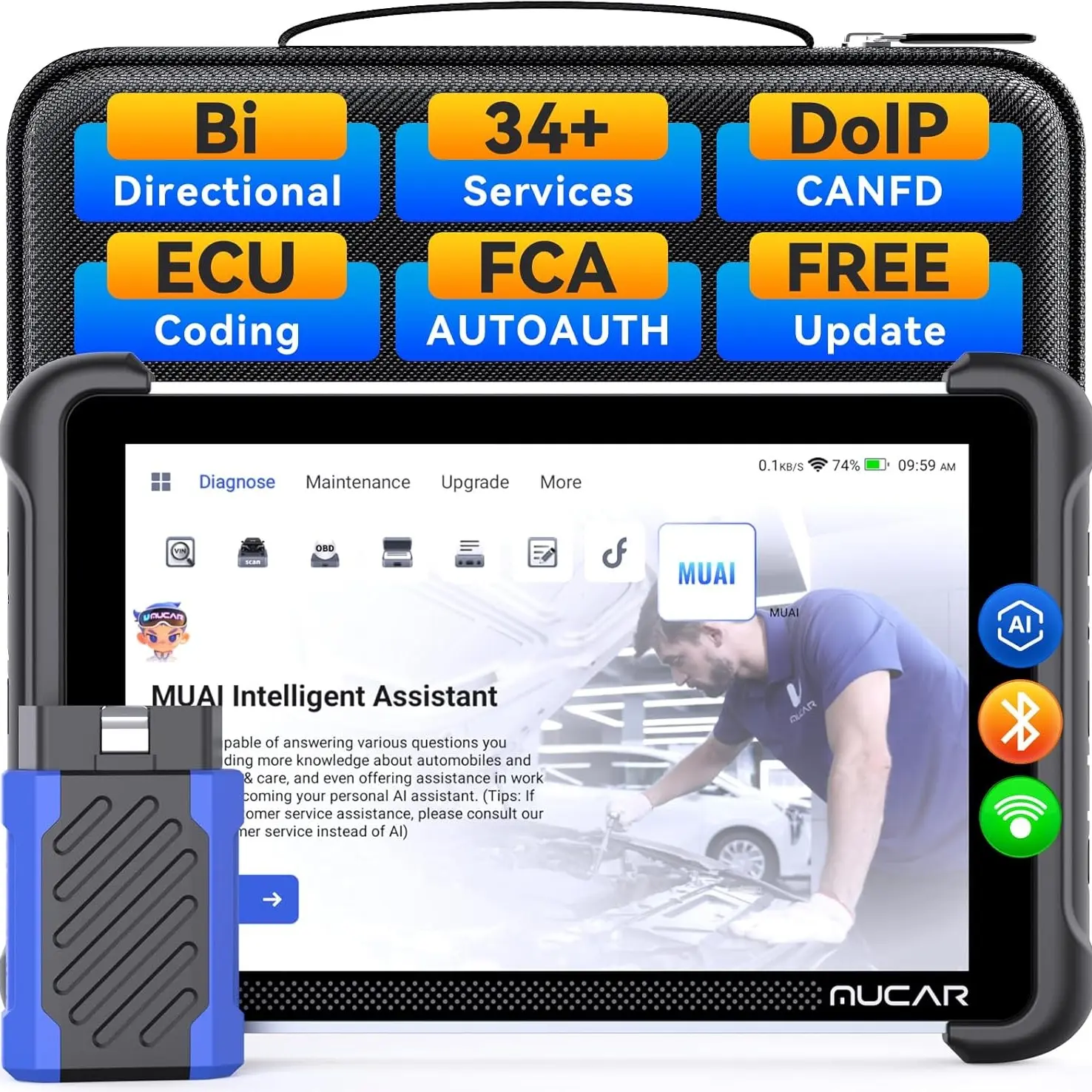 The MUCAR AI-Assisted Automotive OBD2 Scanner Tool offers a lifetime free upgrade. It is an 892BT full system OBD2 scanner designed for comprehensive diagnostics. This bidirectional OBD2 scanner supports ECU encoding and 34 services. It also includes FCA Autoauth, CANFD and DoIP capabilities. Perfect for automotive professionals and DIY enthusiasts.