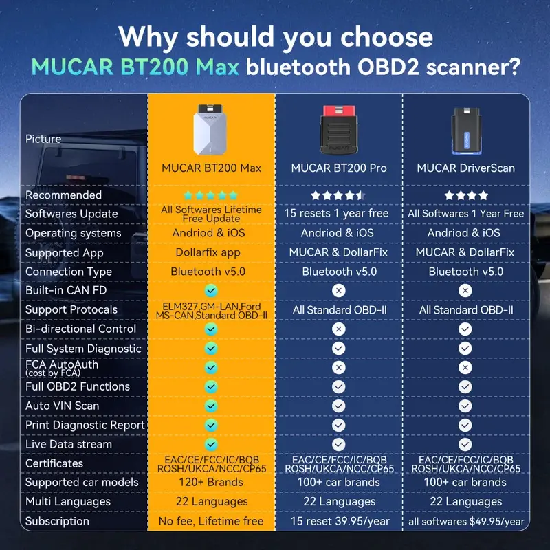 MUCAR BT200 MAX Lifetime Free Auto OBD2 Scanner Full System 15 Reset CAN-FD Bi-directional ECM TCM ABS Car Diagnostic Tools