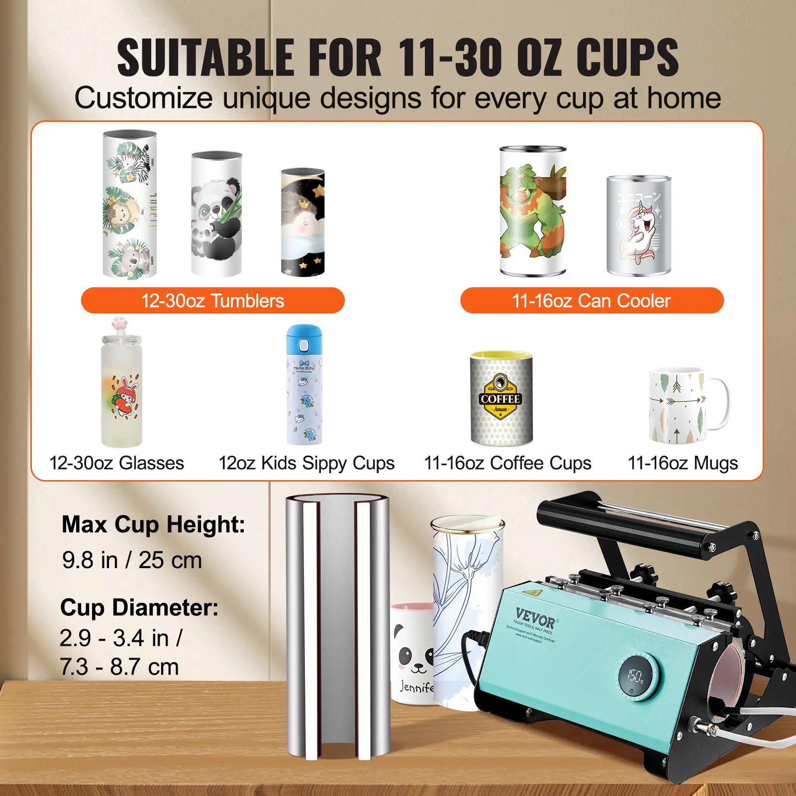 • Adapt to Different Cups: Our mug heat press is versatile, accommodating cup sizes from 11oz to 30oz. Print two 11-15oz vertical mugs simultaneously. The adjustable pressure knob ensures perfect heat transfer by closely fitting the cup. Suitable cup diameters: 2.87-3.42in/7.3-8.7cm. Maximum cup height: 9.8in/25cm.