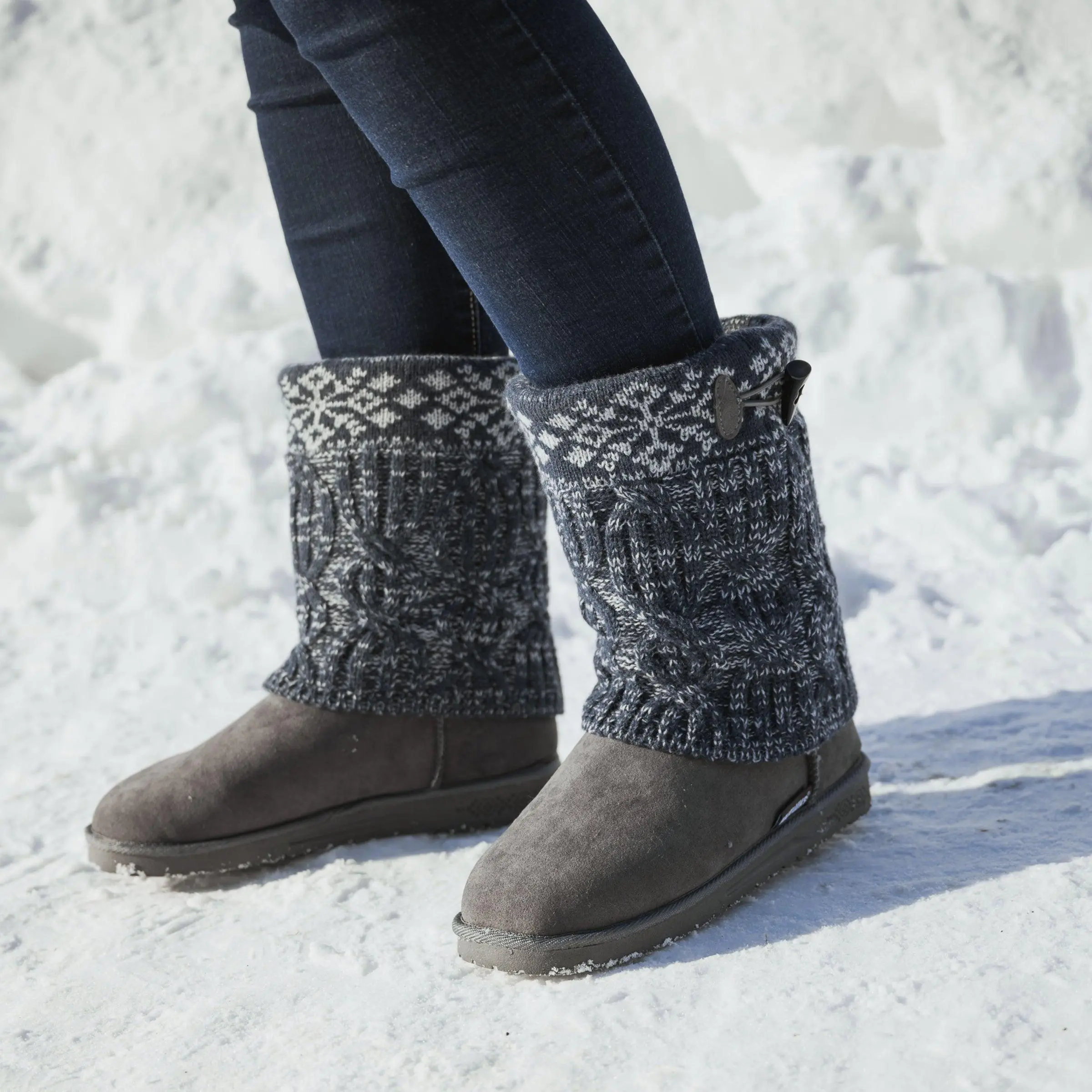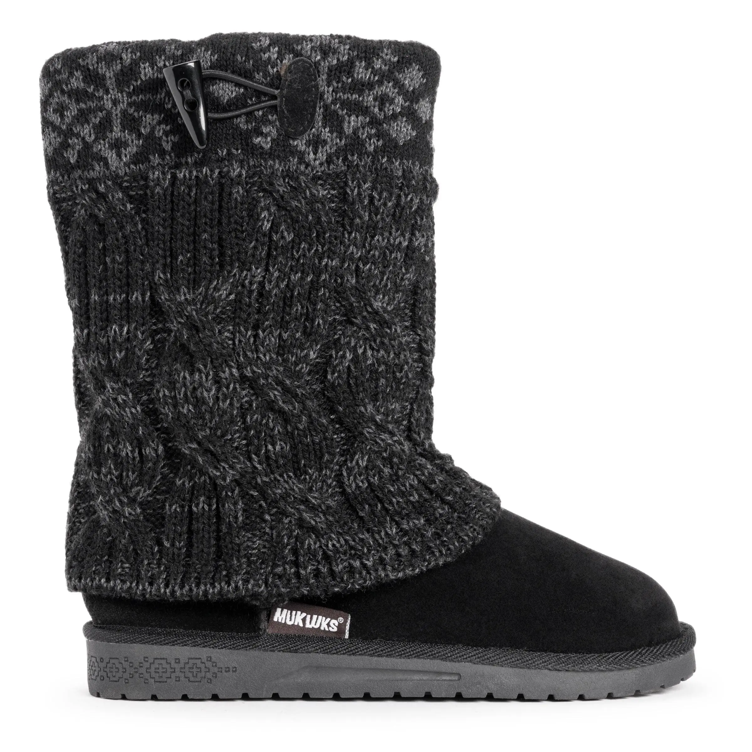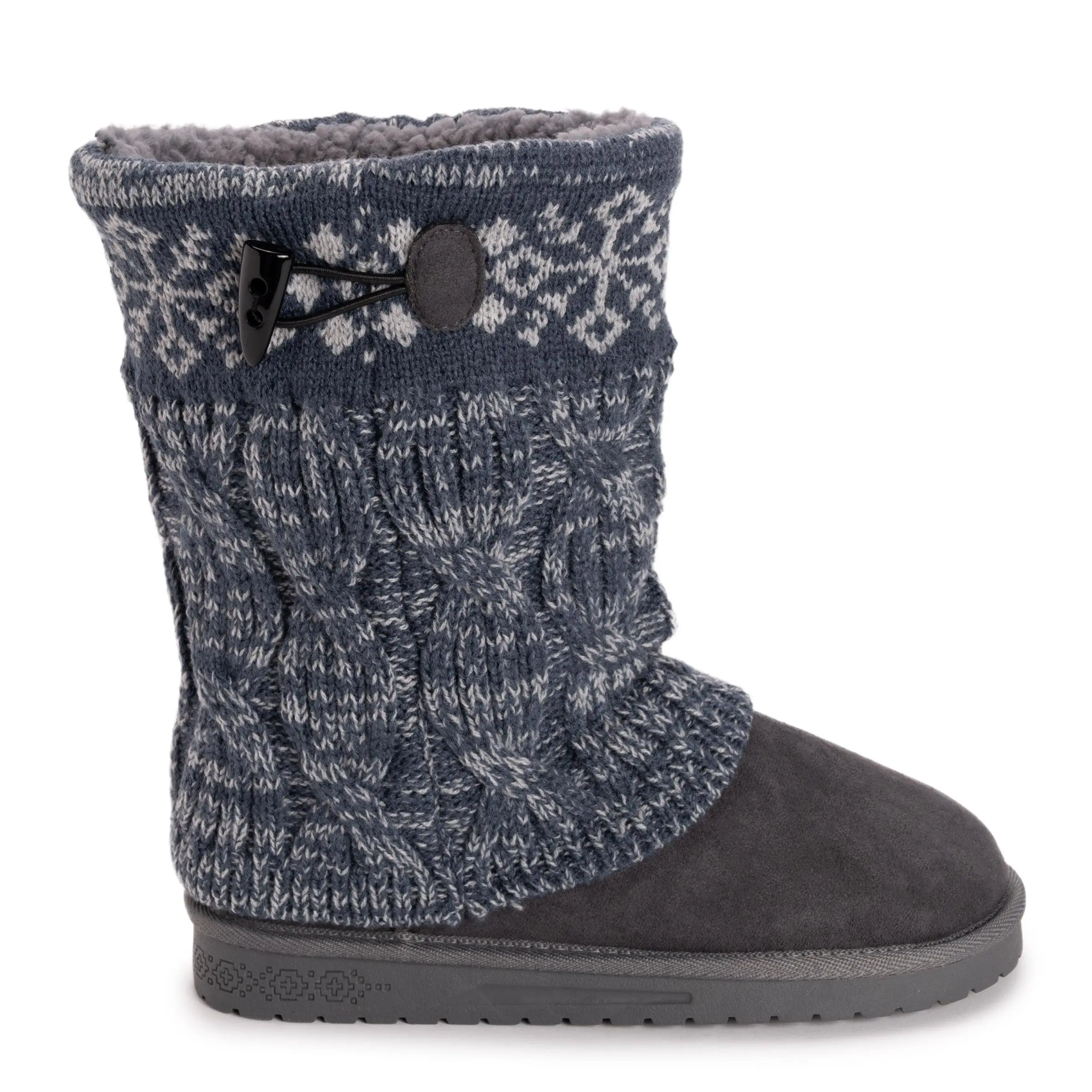 Stay warm and stylish this winter with the Cheryl Boots from our Essentials by Muk Luks collection. These comfortable boots feature a cozy sweater knit design, soft faux fur lining, Toggle detailing and a durable TPR sole, making them water resistant and great for protecting your feet against splashes and slush. With a variety of colors and patterns, the Cheryl Boots offer both comfort and fashion. Wipe with a damp cloth to clean, do not bleach, lay flat to dry