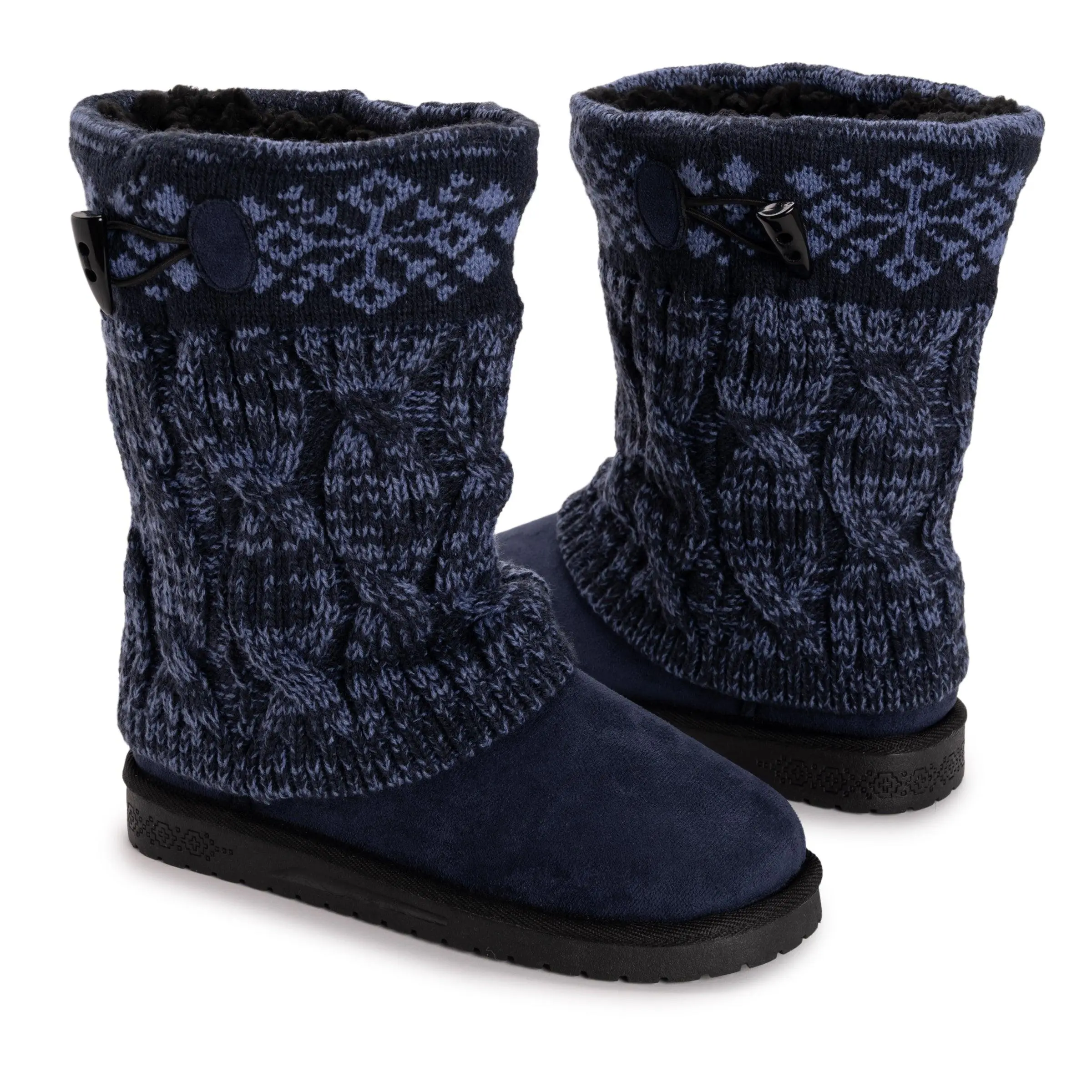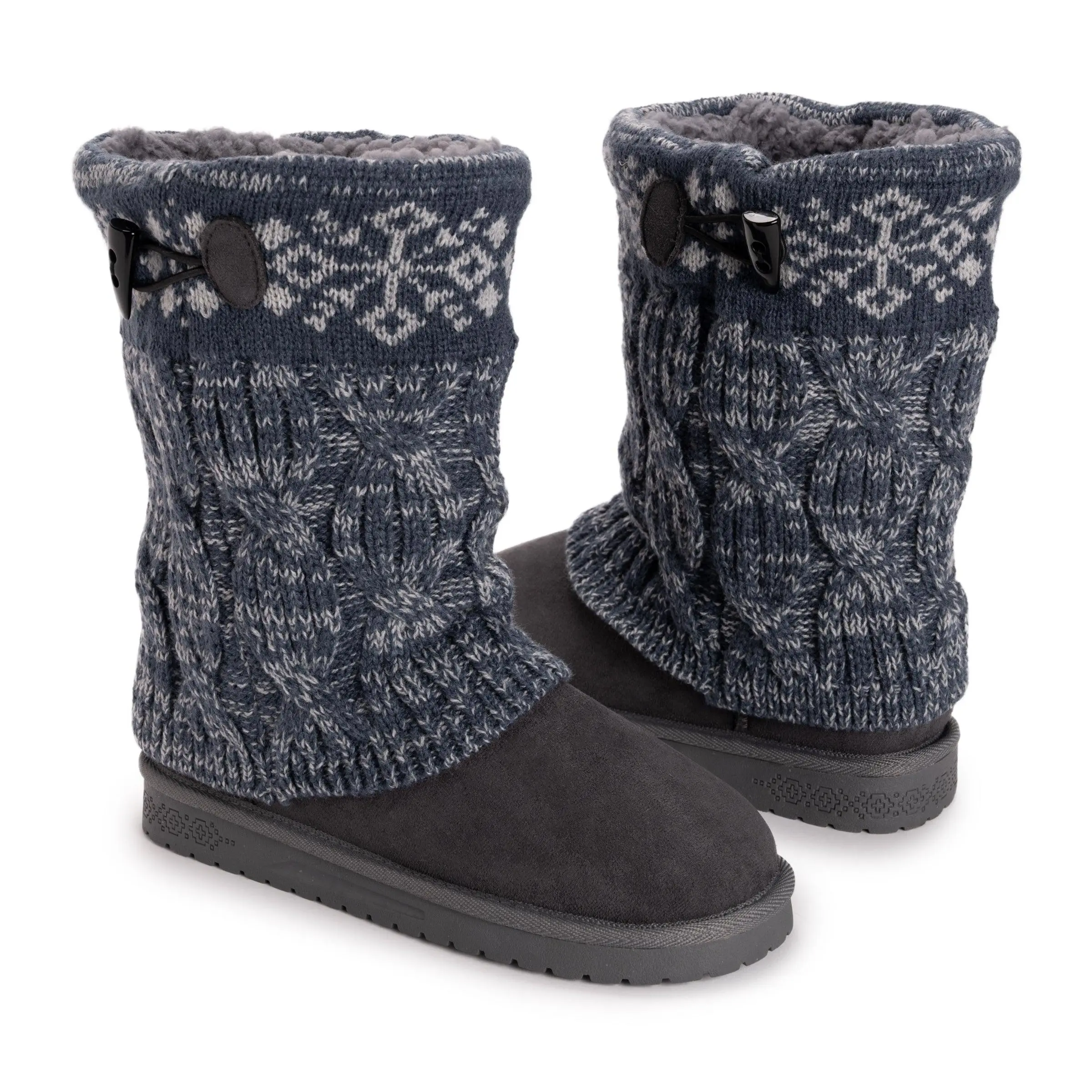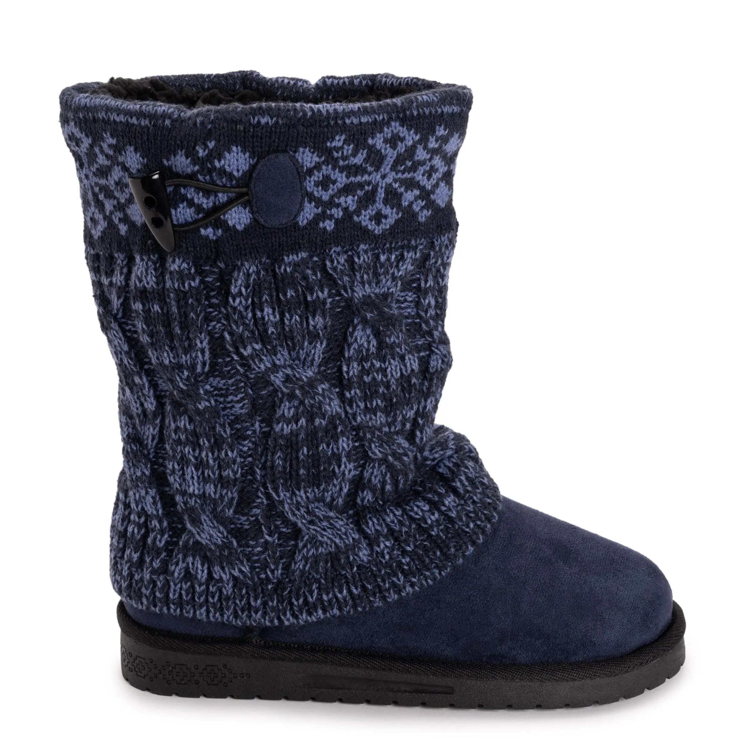 Stay warm and stylish this winter with the Cheryl Boots from our Essentials by Muk Luks collection. These comfortable boots feature a cozy sweater knit design, soft faux fur lining, Toggle detailing and a durable TPR sole, making them water resistant and great for protecting your feet against splashes and slush. With a variety of colors and patterns, the Cheryl Boots offer both comfort and fashion. Wipe with a damp cloth to clean, do not bleach, lay flat to dry