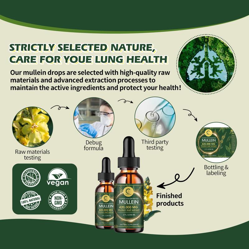 42000 mg Mullein Drops for Lungs: Our ultra-concentrated, alcohol-free mullein leaf extract delivers 42000 mg of pure mullein in each serving. Dedicated to purity and potency, breathing is easier and enhances your lung health