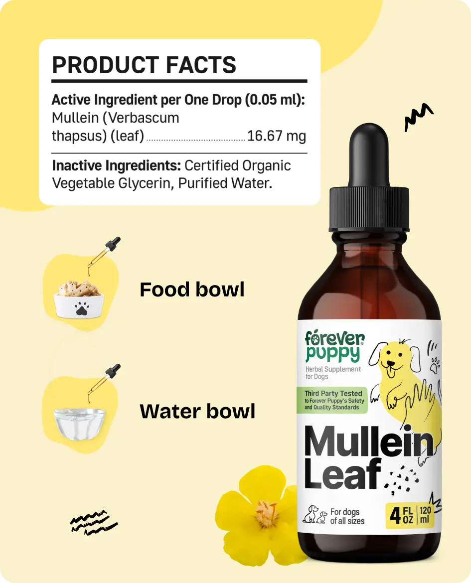 ·Healthy Tails, Happy Trails: Support your dog's easy breathing with our Mullein leaf extract for lungs. Forever Puppy's drops provide respiratory support for dogs and make every sniff a joy.
