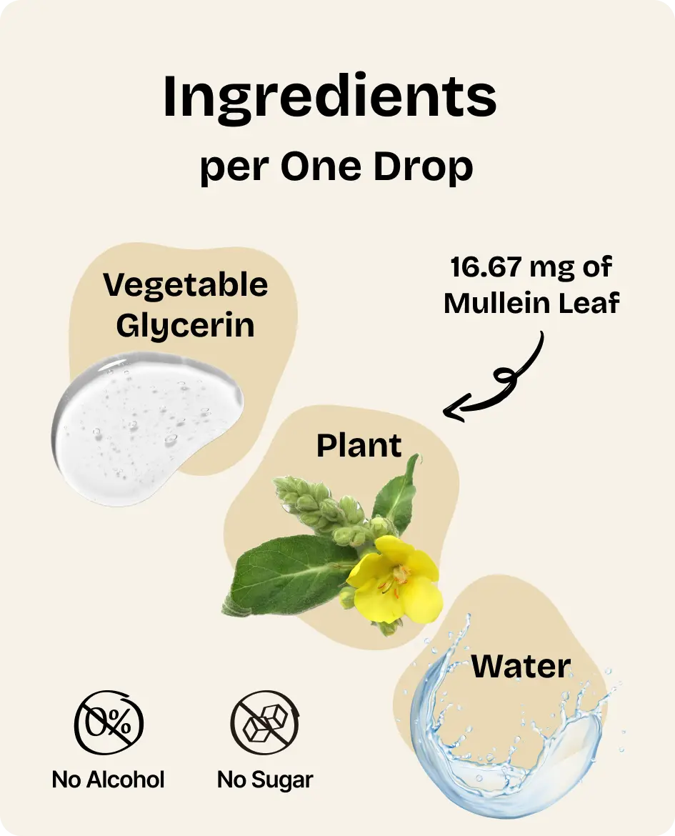 ·Clean Formula: Our mullein herb, purified water, and glycerin create a clean formula, free from sugar, alcohol, preservatives, artificial colors, or animal-derived ingredients.