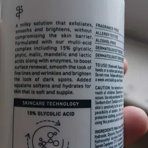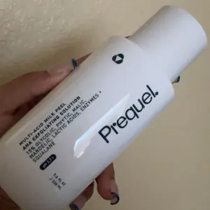 I really love this prequel, multi acid milk, peel and exfoliating solution. It’s 15% glycolic acid along with some other acids and enzymes and squalling. It helps exfoliate, smooth, brighten, soften, and hydrate.