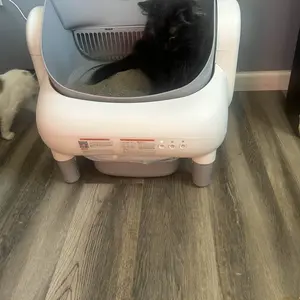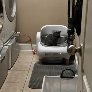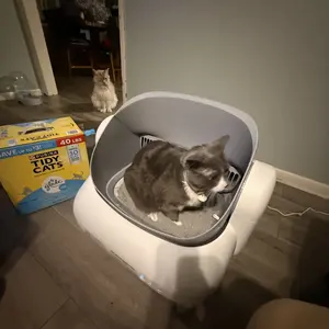 Image Note: The image showcases the litter box with a cat sitting next to it, highlighting the open-top design and the app control feature.