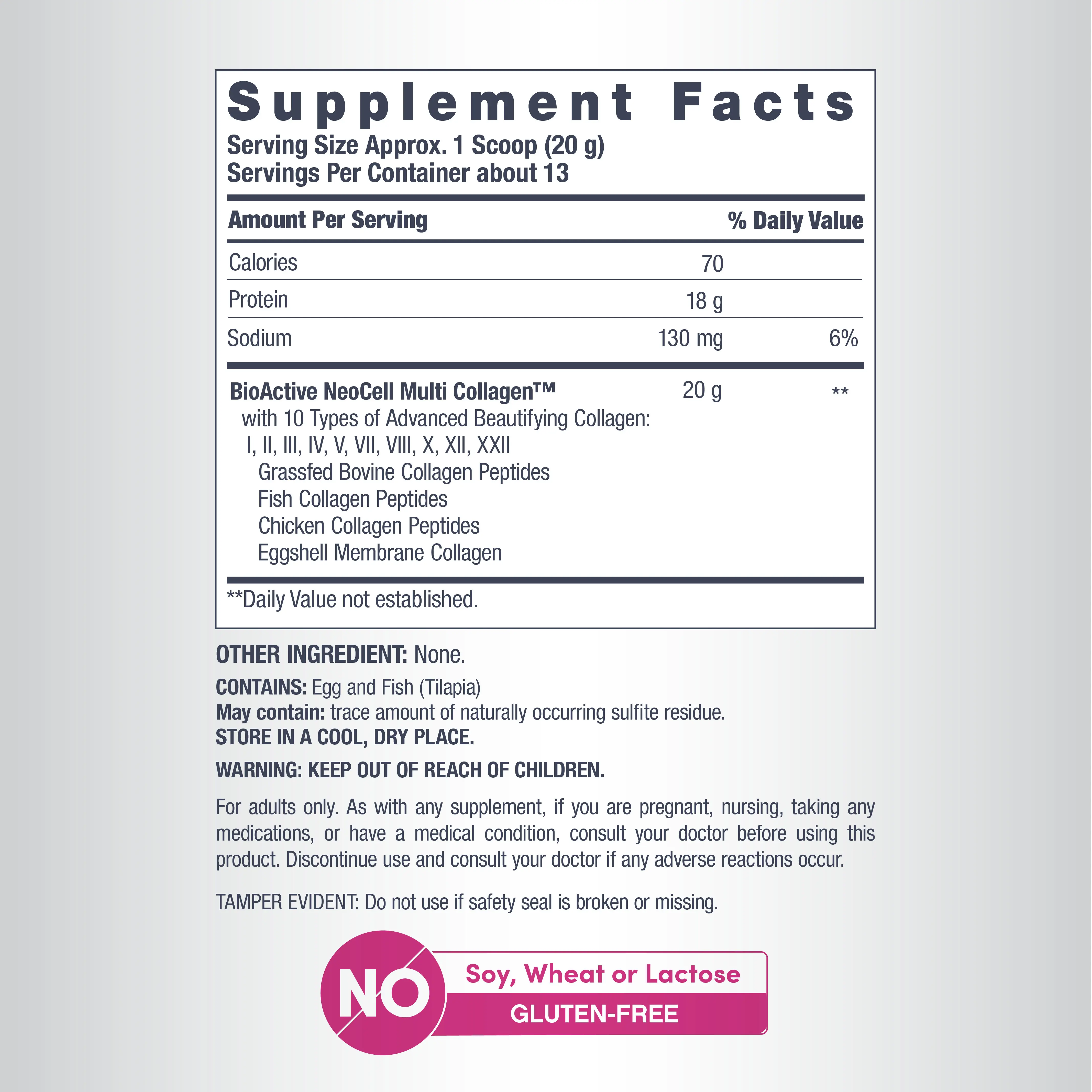 NeoCell Multi Collagen Powder is specially formulated with 10 types of collagen. NeoCell Multi Collagen Powder contains hydrolyzed collagen—or collagen broken down into smaller molecules, called peptides. Hydrolyzed collagen can provide your body with some of the building blocks it needs to create its own collagen and other proteins like keratin, which is found in nails and hair. This IGEN Non-GMO Tested, unflavored, Paleo-friendly collagen powder is gluten-free and contains no soy, dairy or artificial flavors.