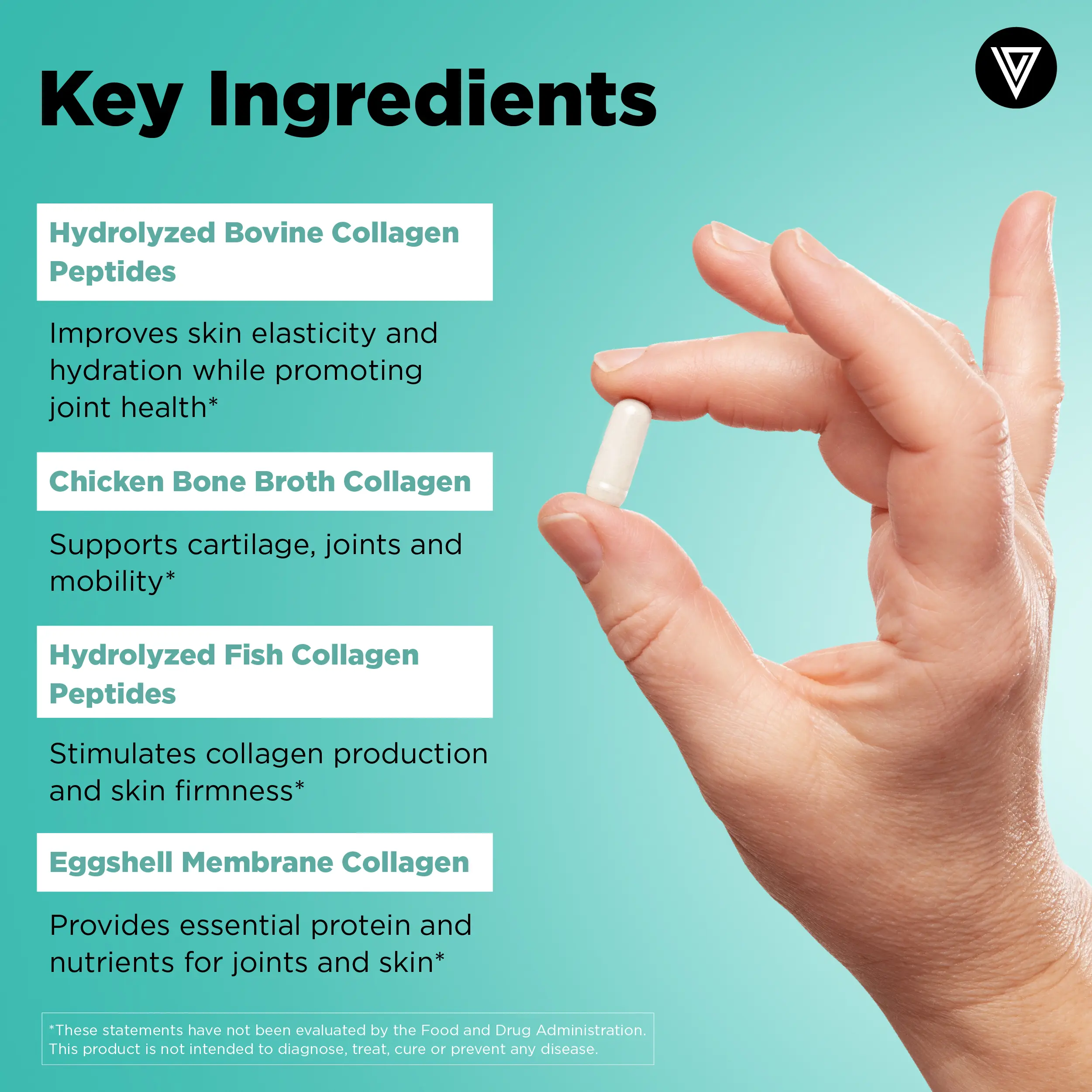 ·Multi Collagen Blend: 1,600 mg(Hydrolyzed Bovine Hide Collagen, Chicken Bone Broth Collagen, Hydrolyzed Fish Collagen, Eggshell Membrane Collagen)