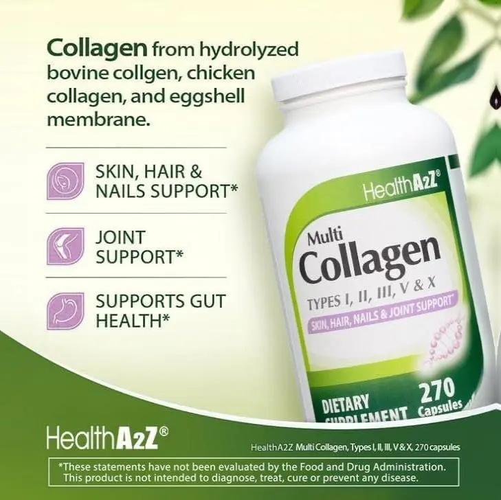 ·HealthA2Z All-In-One Collagen Supplement is a potent blend of Hydrolyzed Bovine Collagen, Chicken Collagen, Eggshell Membrane Collagen, and Types I, II, III, V, and X Collagen in a convenient easy to absorb capsule form.