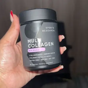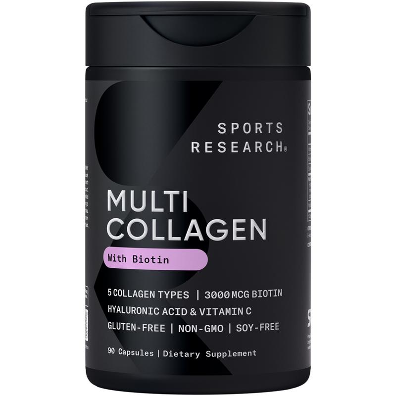 Sports Research Multi Collagen Complex with Biotin contains Vitamin B7 along with Type I, II, III, V, and X Collagen. It also includes Hyaluronic Acid & Vitamin C—a synergistic blend of nutrients for skin health.