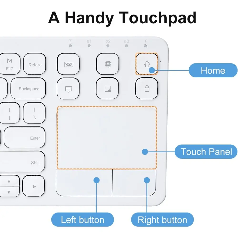 【3 DEVICES SWITCH & SENSITIVE TOUCH PAD】- This Bluetooth keyboard trackpad adopts Bluetooth technology, ensures a stable and cable-free connection, working distance: 32.8ft. Easily switch between 3 devices, greatly upgrade work efficiency. Features a multi-touch trackpad to provide effortless navigation. Works with different finger gestures. It can realize left/right click of the mouse, drag, cursor moving, page up/down, zoom in/out, open Cortana/task, Open Menu, windows switch, etc.
