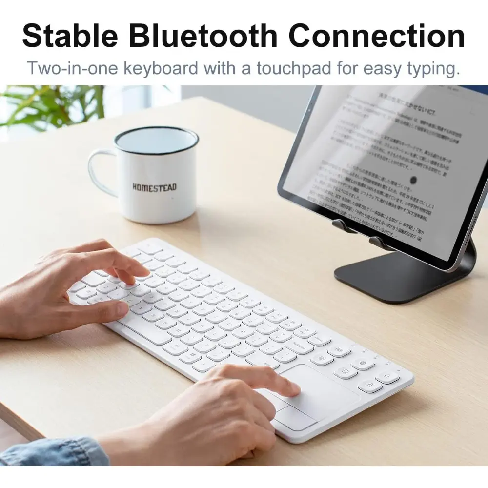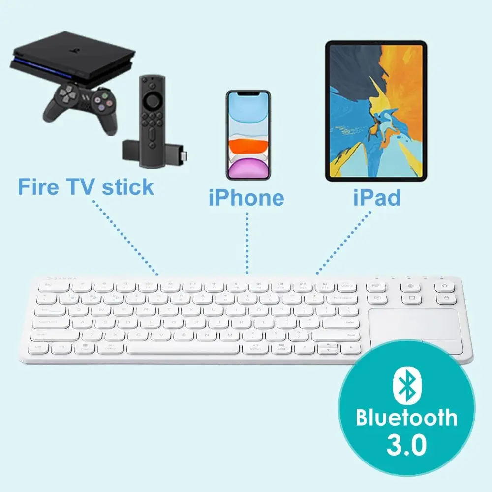 【WIDE SYSTEMS COMPATIBILITY】- Bluetooth keyboard with touchpad is compatible with systems: Windows 13/11/10/8.1/8/7/XP/Vista/98/2000/Me, macOS 10.12-10.15, Android 7.0-10, iPad OS13, iOS13 and version later. Besides, it works with desktop computers, laptops, cell phones, tablets, Mac, iPad, iphone, and Android TV BOX/ Smart TVs/HTPC. Combine work and movie/TV leisure.