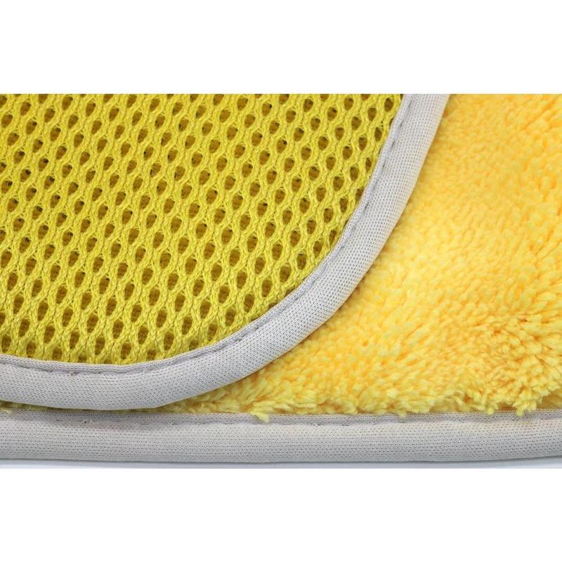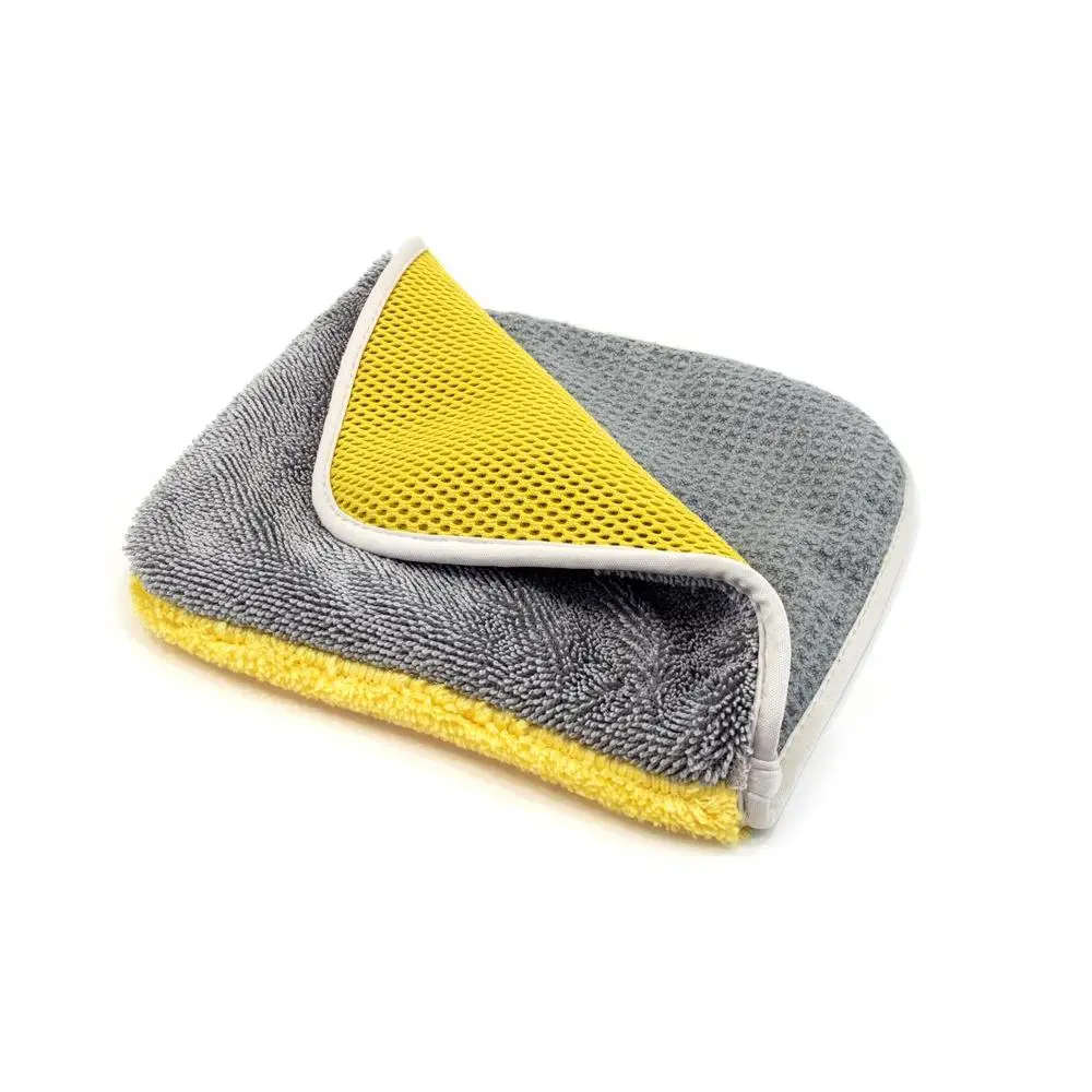 The outside features a gray waffle weave for glass, and a gold mesh material for more aggressive scrubbing. The inside features a gray twist pile for high absorbency streak and lint free wiping, and a gold plush pile for quick detail sprays and delicate finish work.