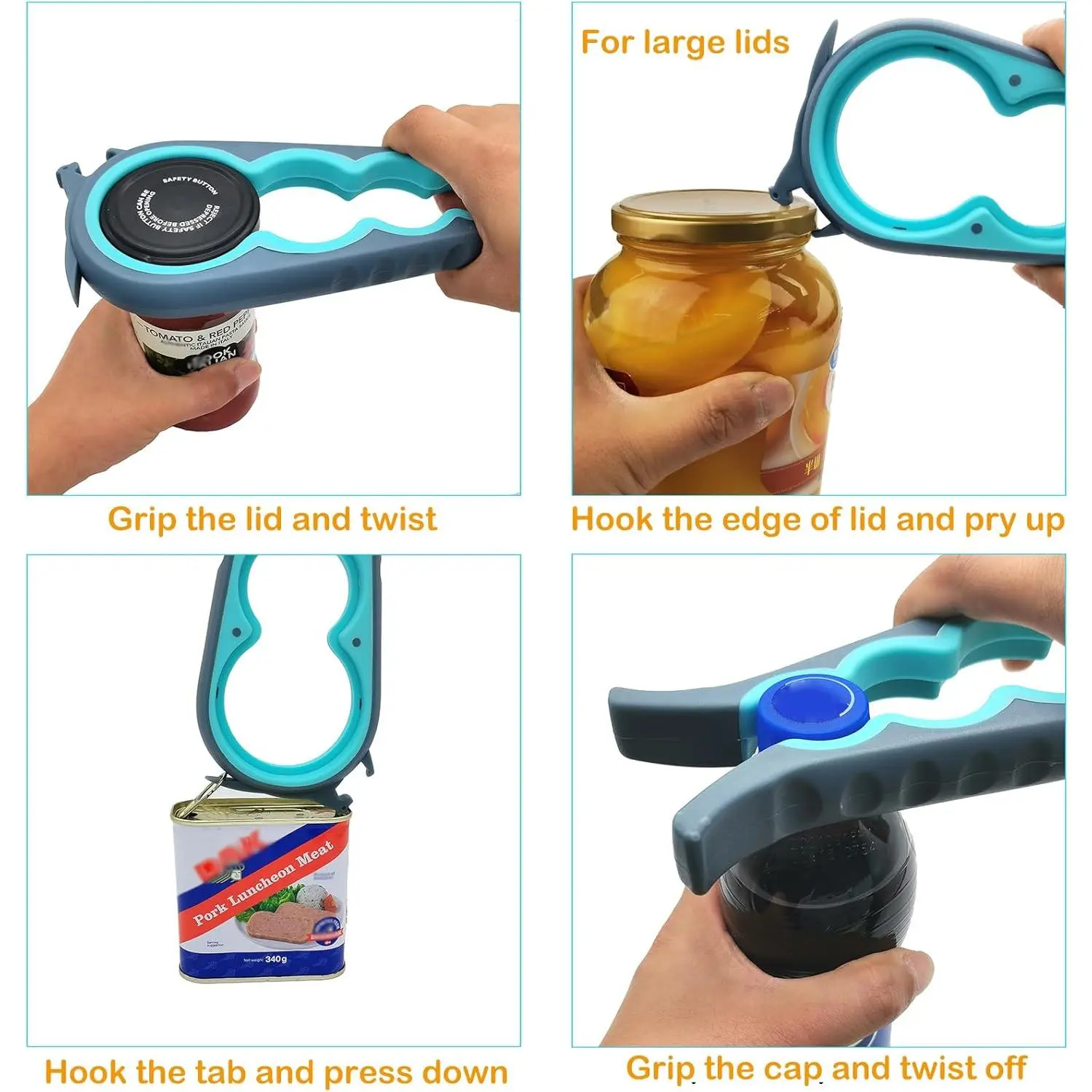 The latest design allows you to open jar lids in two ways:1. Pry off the cover by breaking the air tightness. 2. Grip the lids and twist off