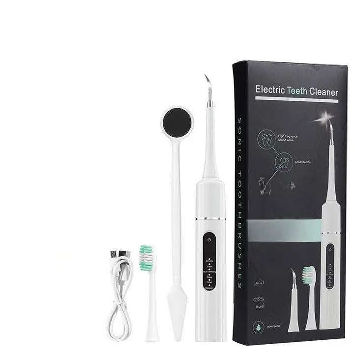 Ultrasonic calculus remover with 5 intensity modes. Built from food-grade ABS and medical-grade stainless steel. IPX7 waterproof for easy cleaning under running water.
