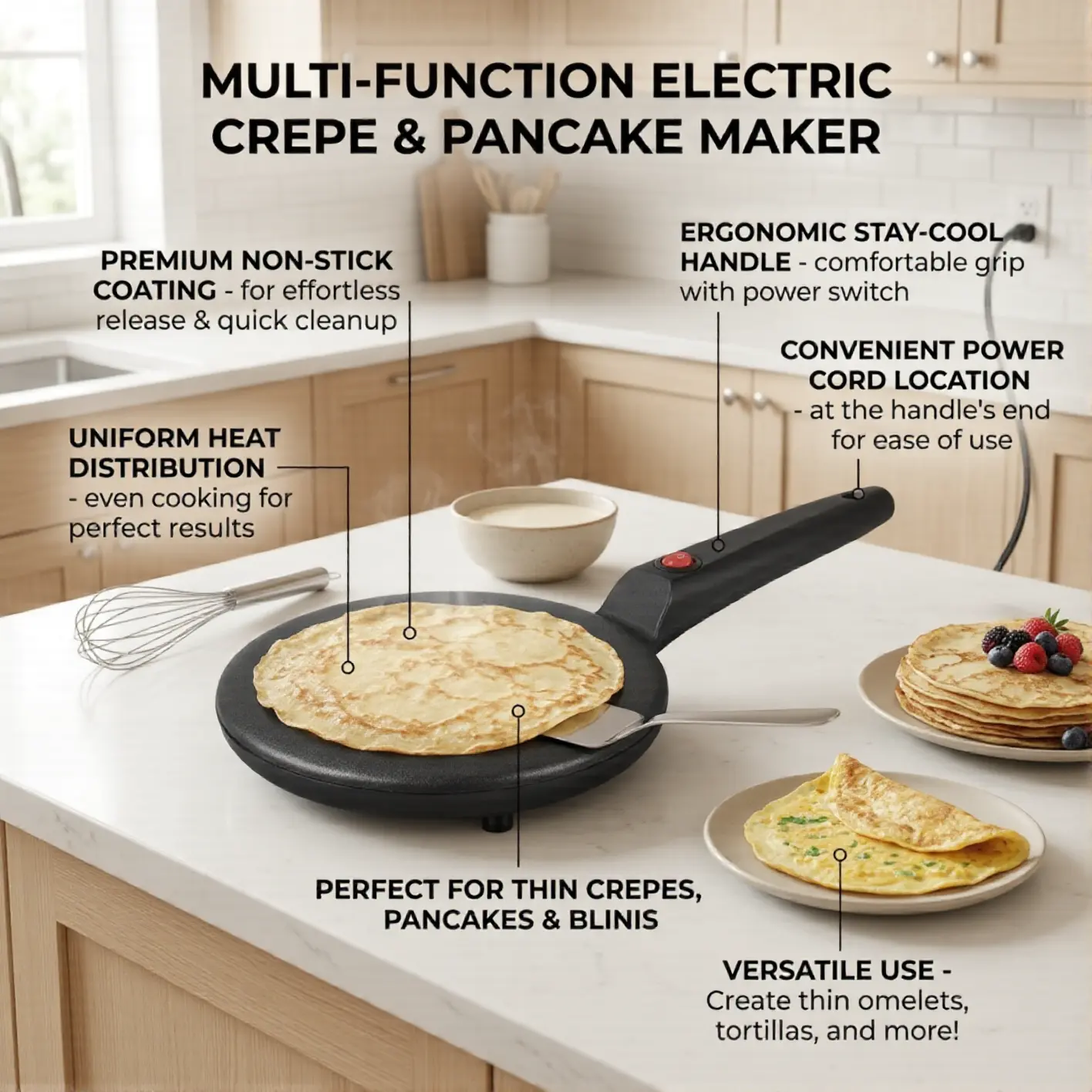 Multi-Function Pancake Maker, Non-Stick Crepe Maker & Crepe Machine - Non-Stick Heating Plate with LED Indicator Light, Easy to Clean, Compact Home Breakfast Machine