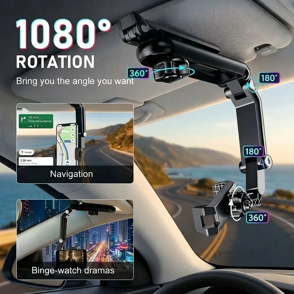 2.360-Degree Rotation: With a 1080° rotatable feature,this sun visor car phone mount can be adjusted to anyangle for comfortable viewing.
