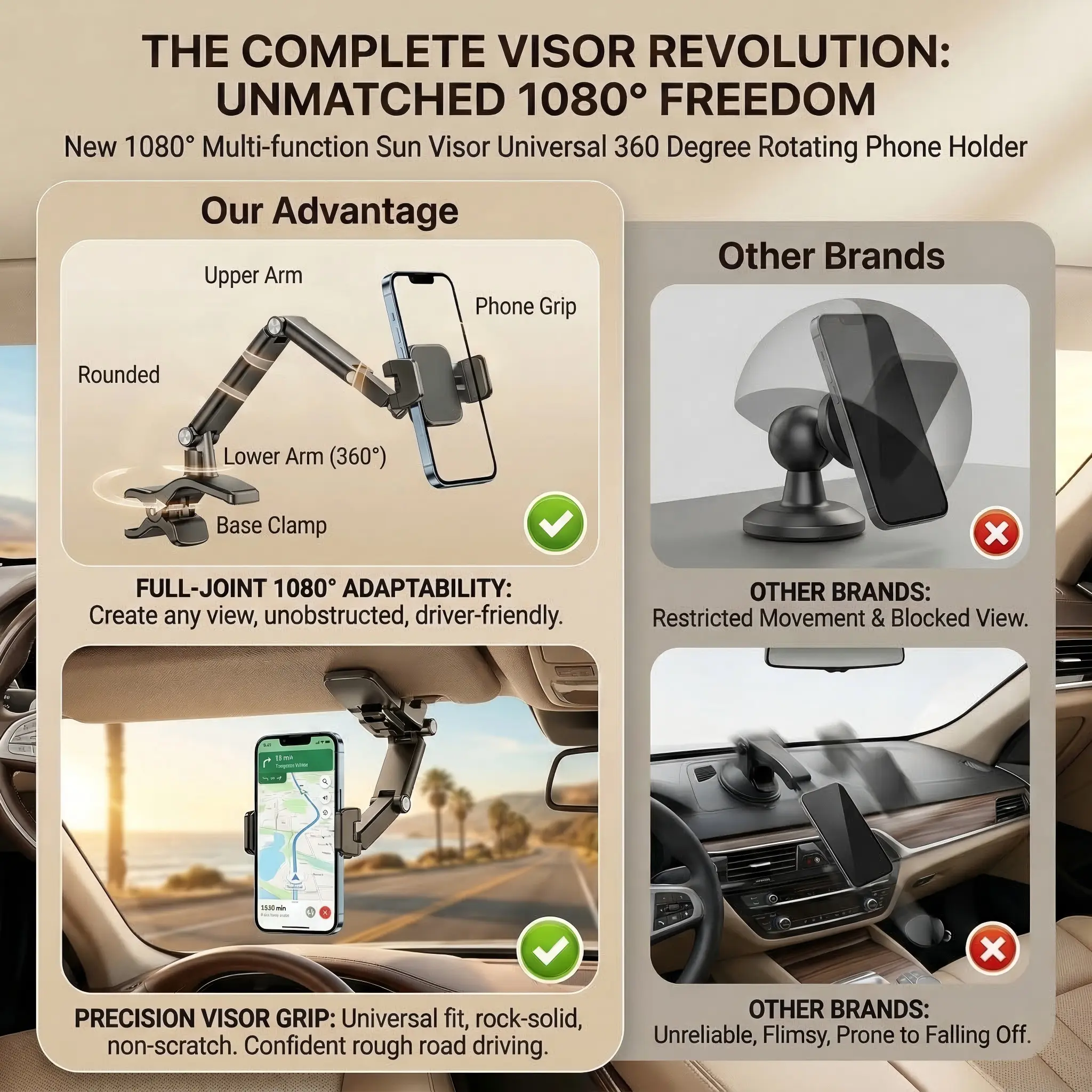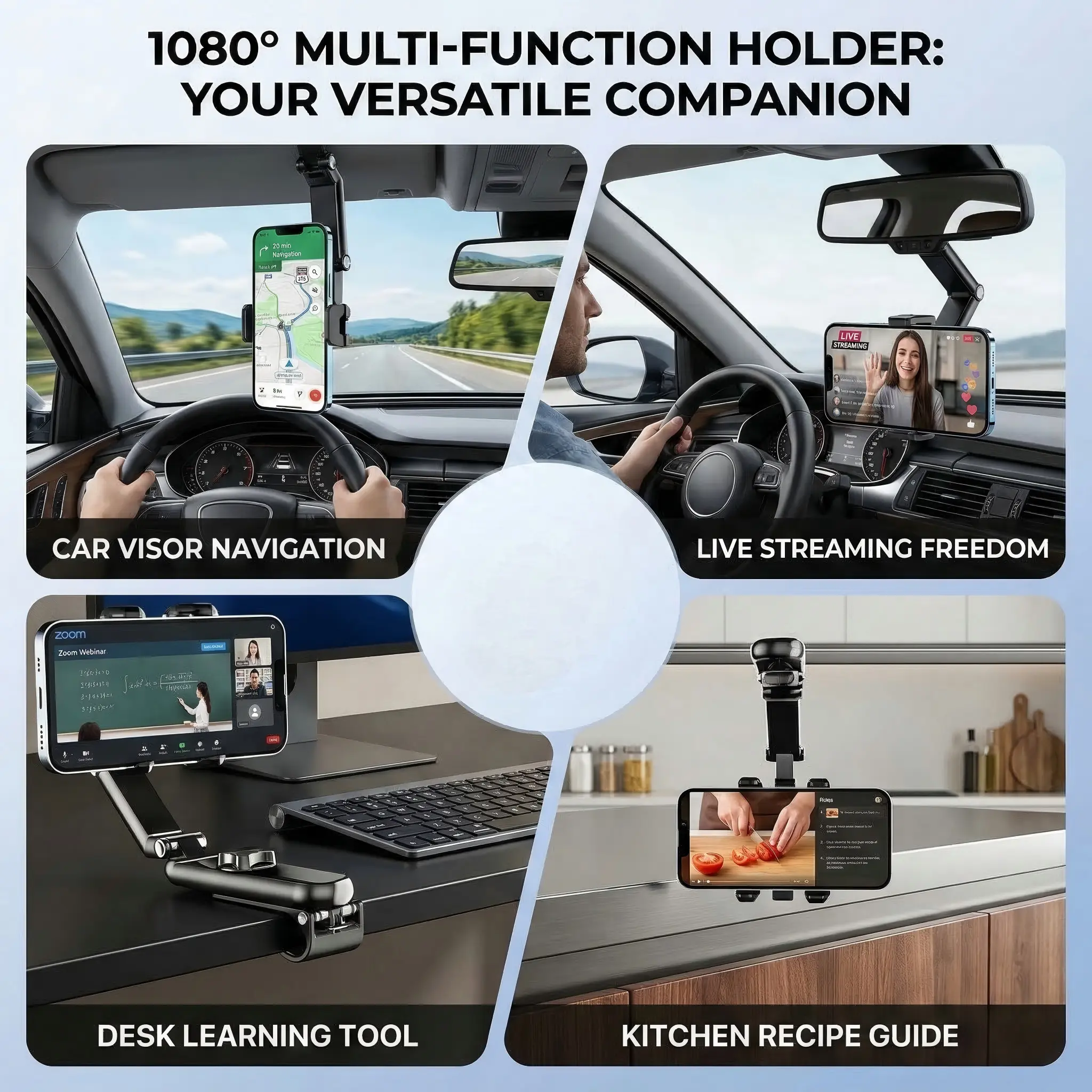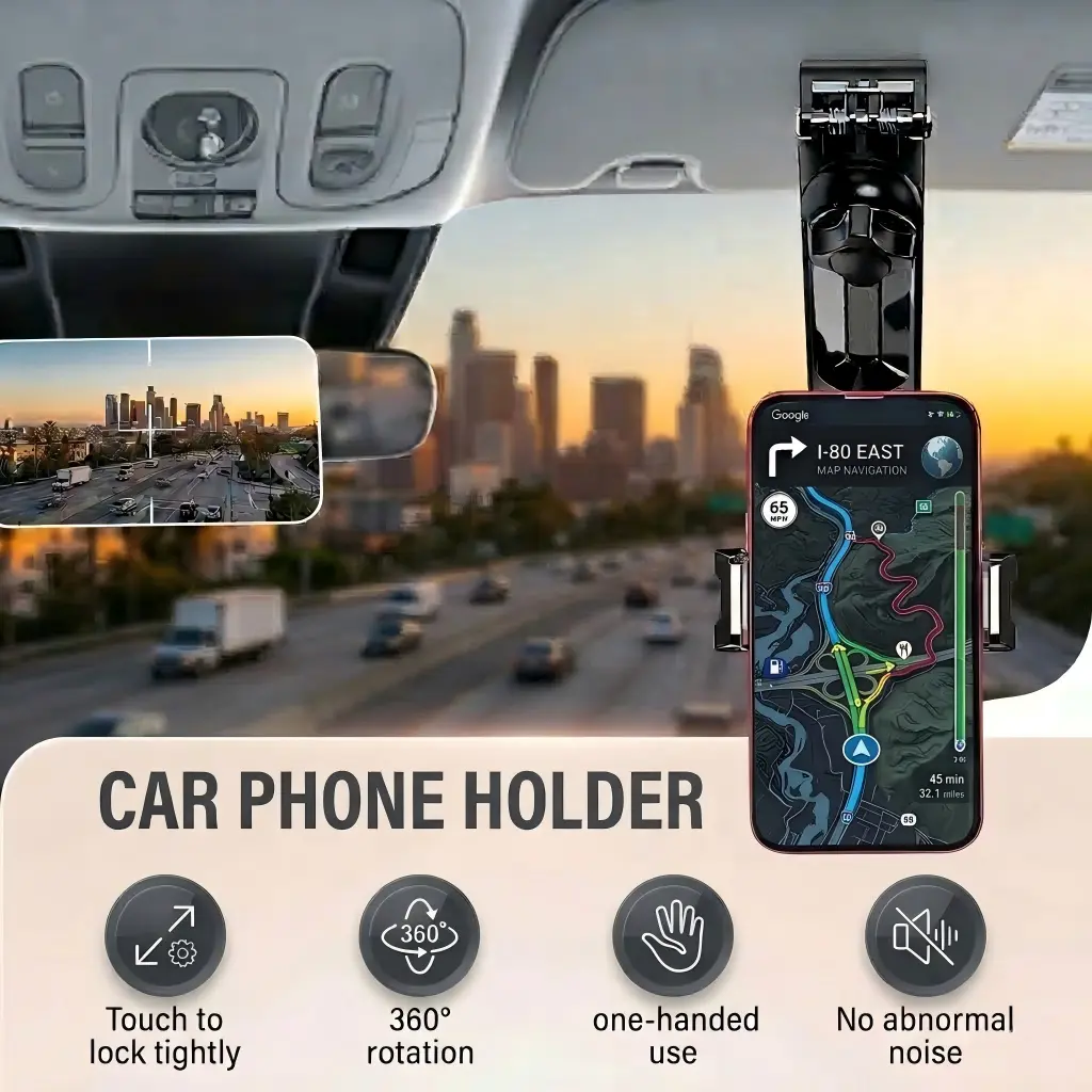 Introducing the New 1080° Multi-function Sun Visor Universal 360 Degree Rotating Phone Holder, designed to enhance your driving experience with convenience and functionality.