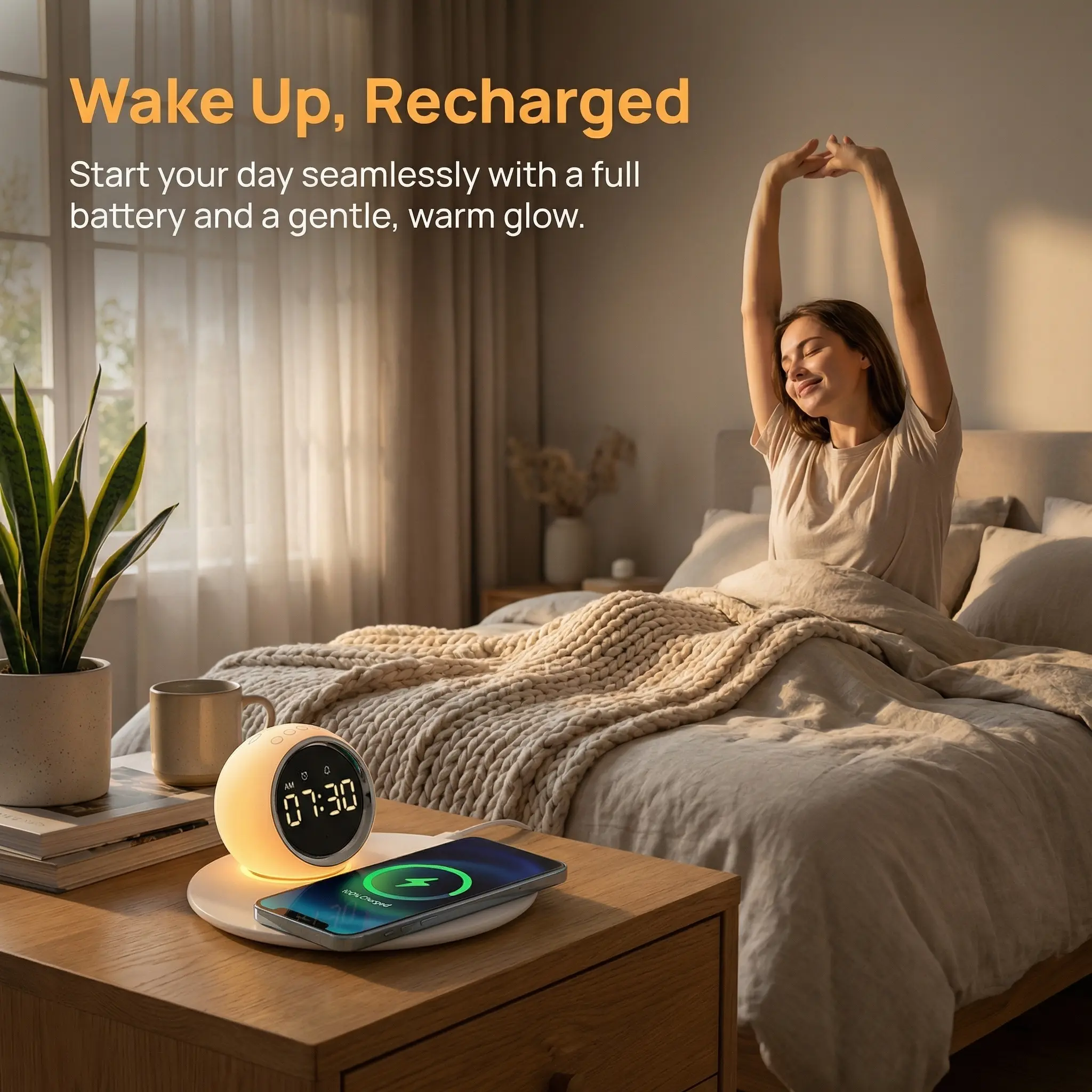 5. User-Friendly Operation Simple button layout with alarm and snooze functions. Independent controls for night light and charging, perfect for daily and nighttime use.