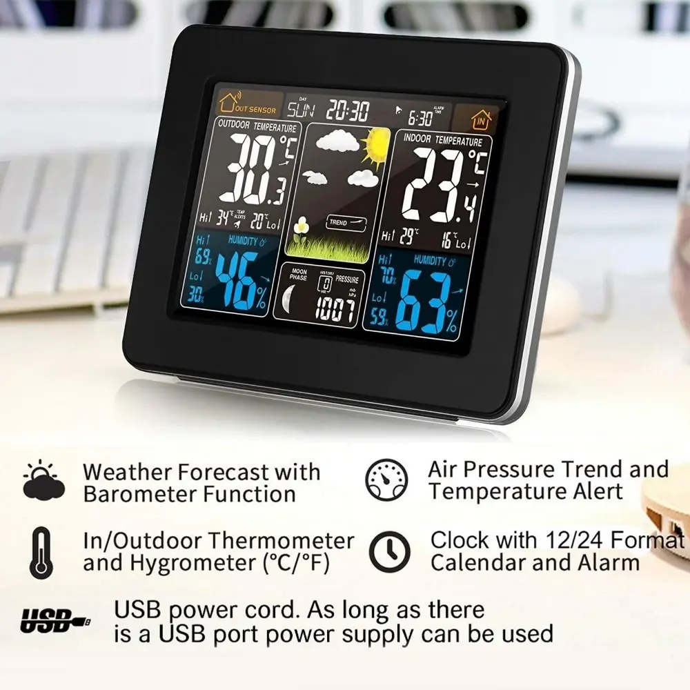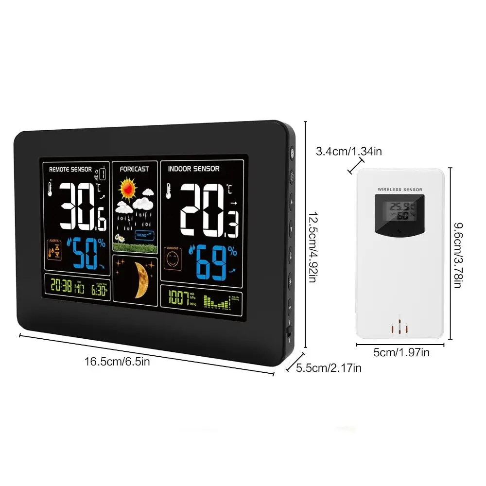 Multi-Function Wireless Weather Station with Color Display, Indoor Outdoor Lcd Thermometer Hygrometer, Alarm Clock, Weather Forecast, Barometer, Moon Phase and Environmental Monitor for Home.