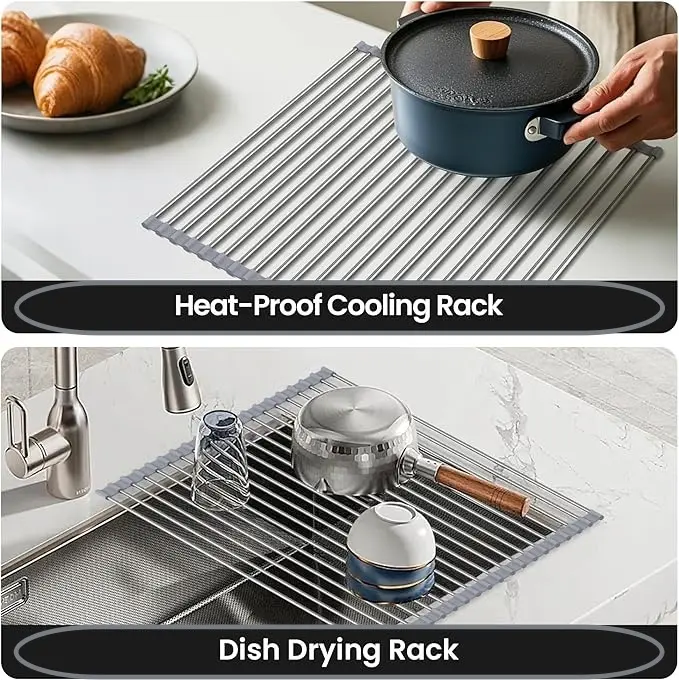 Crafted from 304 stainless steel and food-grade silicone, this roll-up dish mat is sturdy, rust-resistant, and BPA-free. It supports heavy cookware while remaining safe and reliable for everyday kitchen use. 🍽️