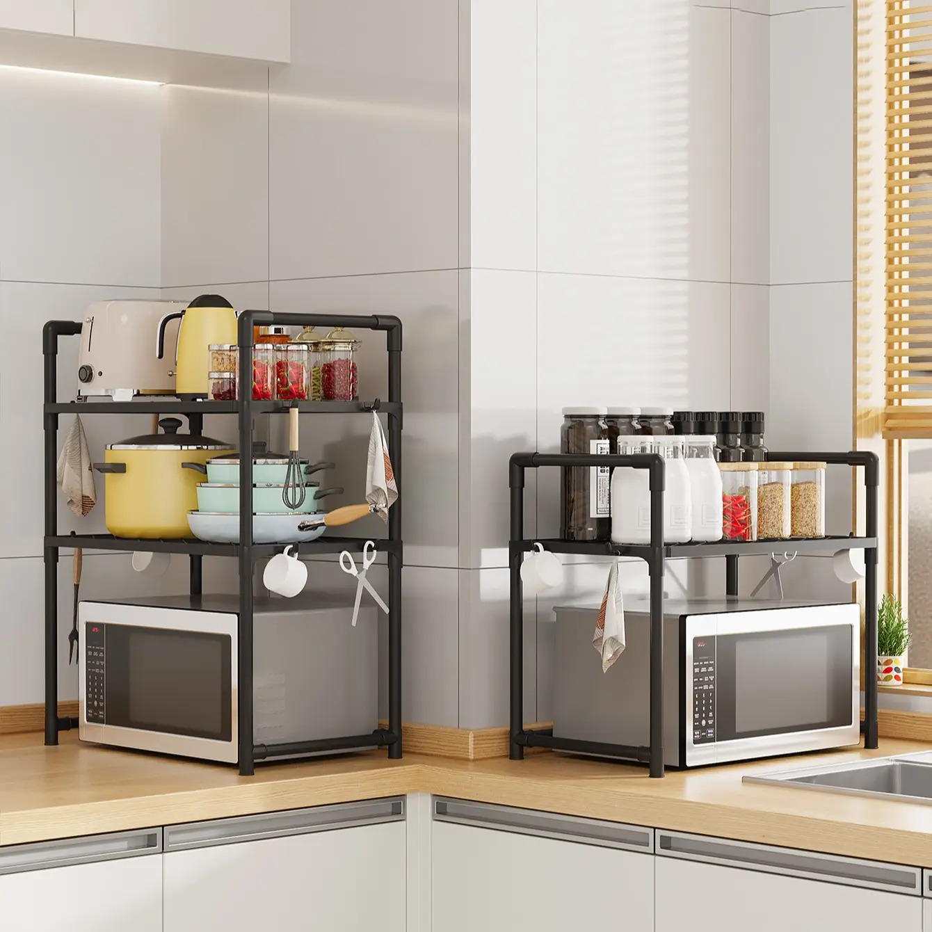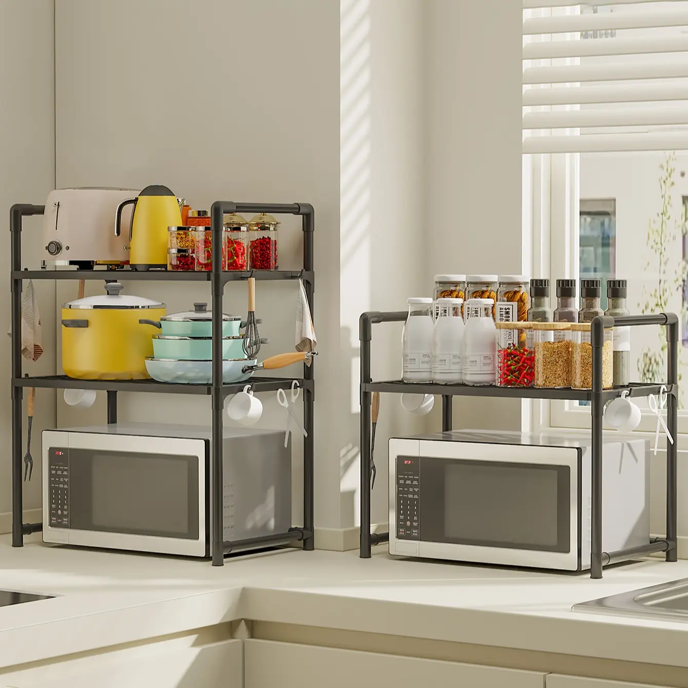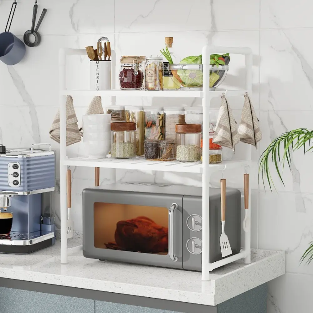 Multi-Functional Kitchen Countertop Storage Rack, Microwave Heightened Organizer, Thick Plastic Shelf for Spices & Dishes, Dual-Layer Design, Convenient Hooks