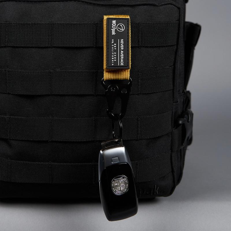 The nylon portion includes WOLFpak est. 2020 Logo Patch branding on one side and hook/loop strip for additional patches on the opposite side with a convenient fold over to attach to your Molle area of the WOLFpak, Waist Belt or End of the Zipper holding your keys or use as a Zipper Pull.